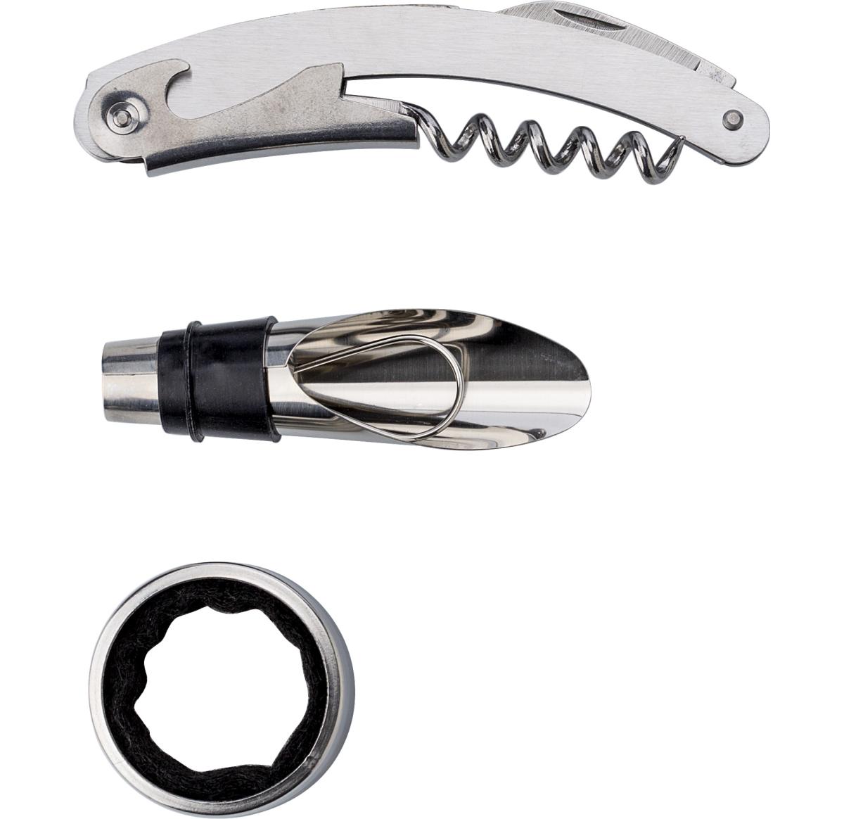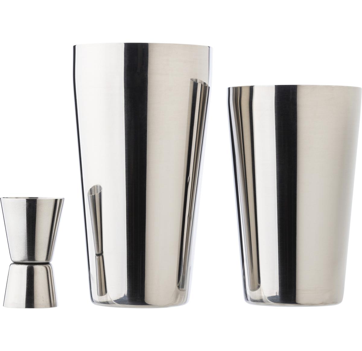 Stainless steel cocktail set. Including shaker (750 ml), measure cup (30 ml), spoon, and sieve. Packed in cotton pouch
