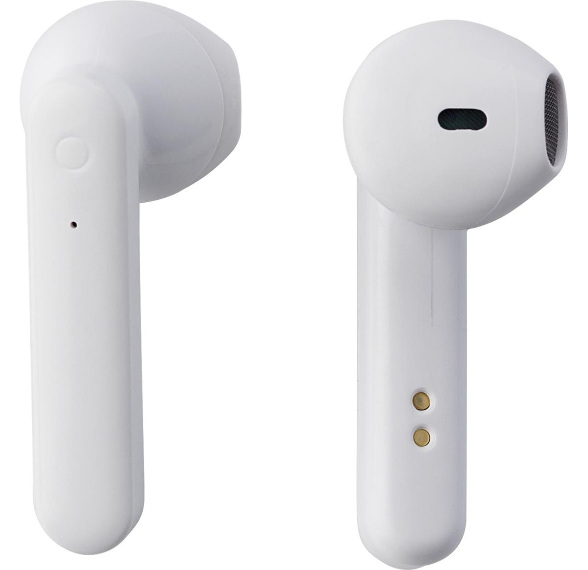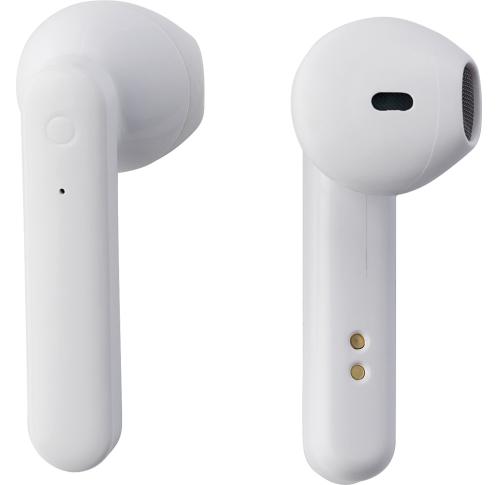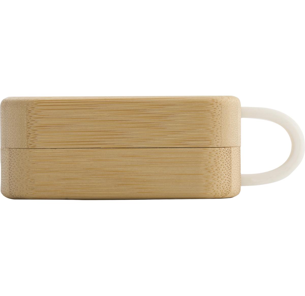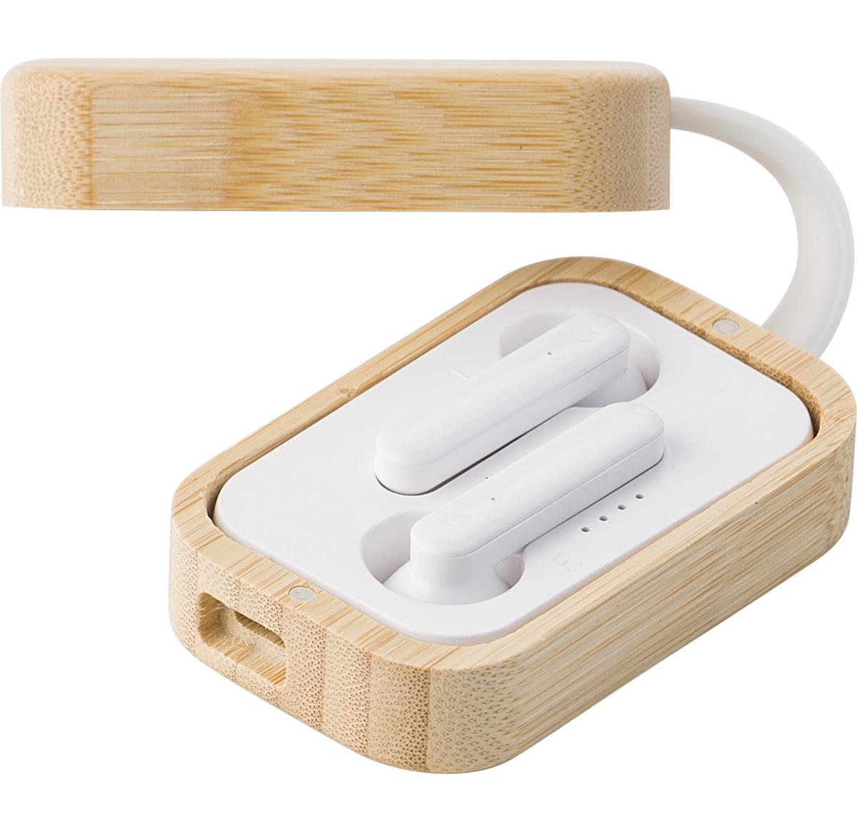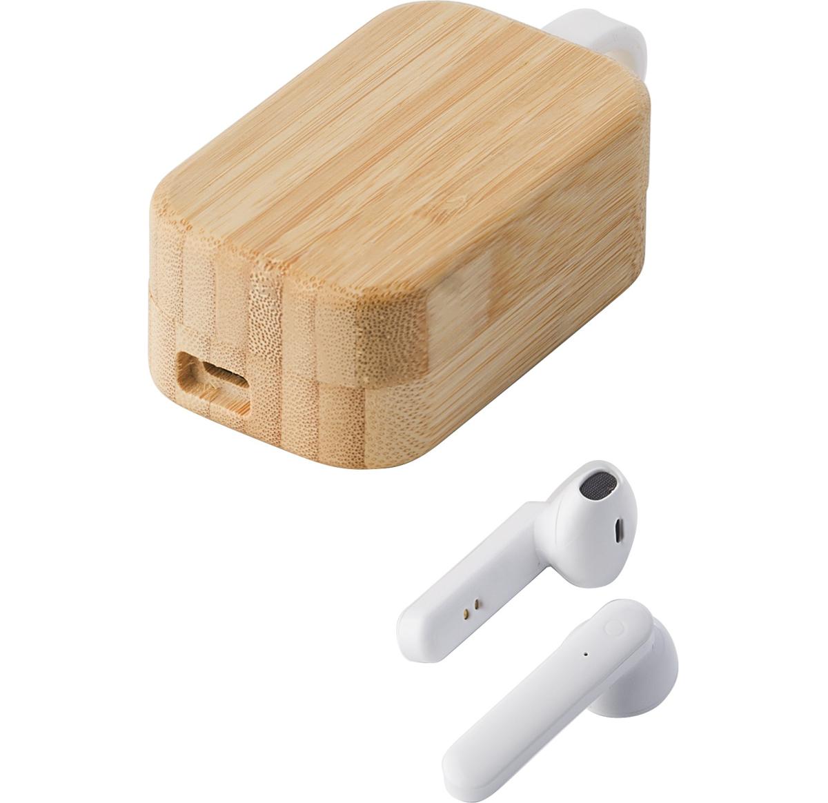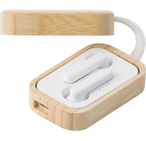 Earphones in a bamboo case with wireless technology version 5.0. Includes charging cable.