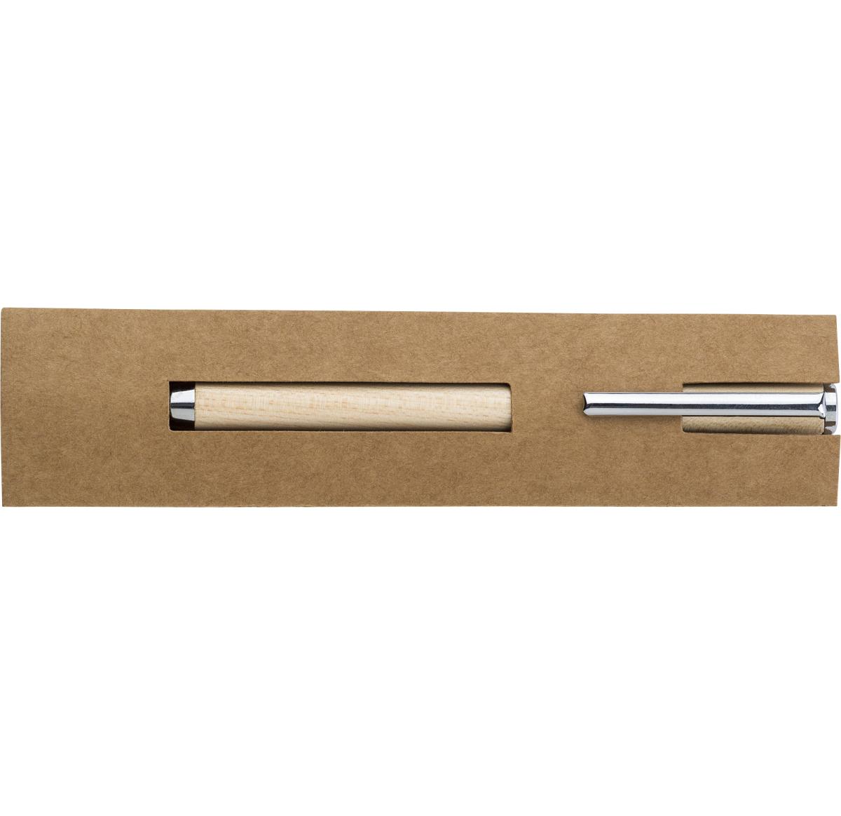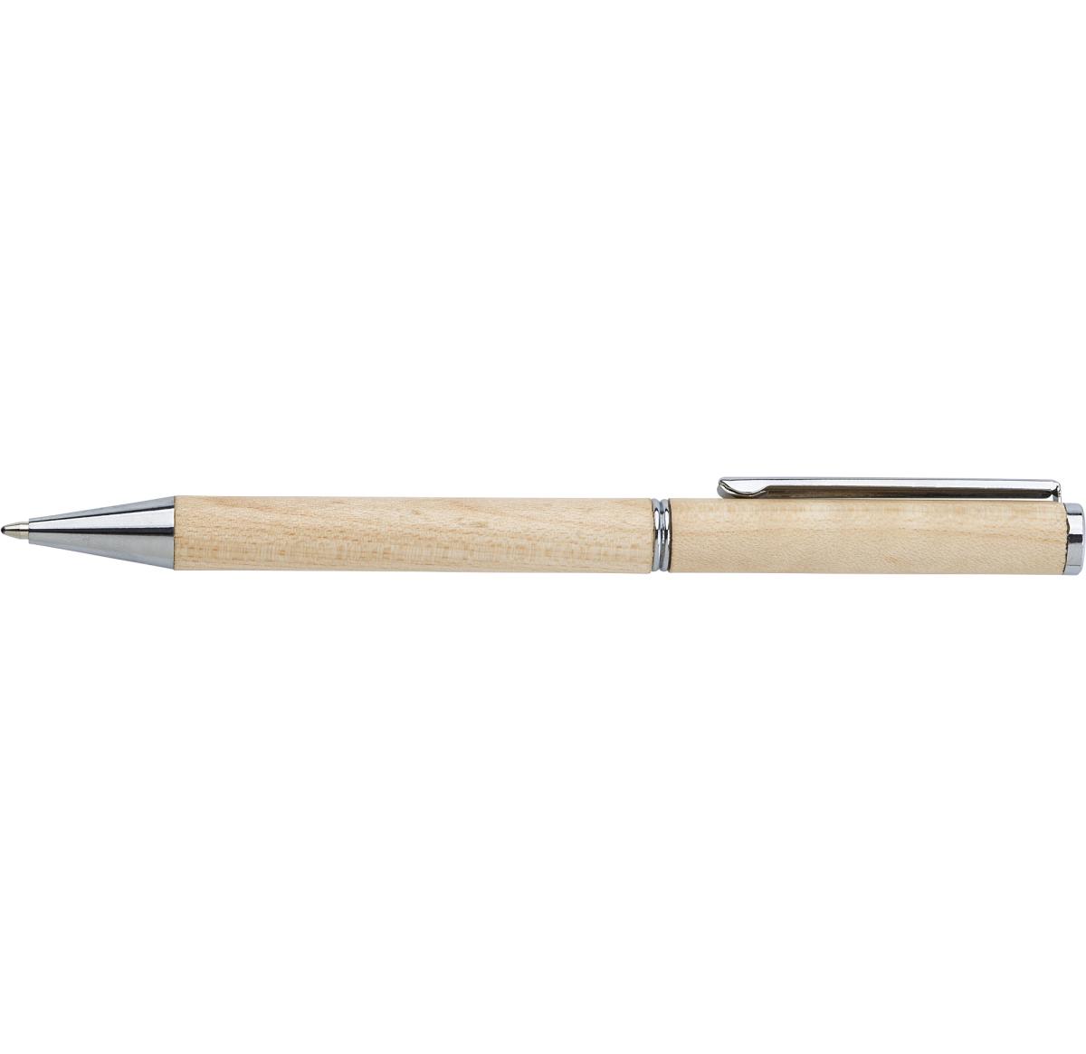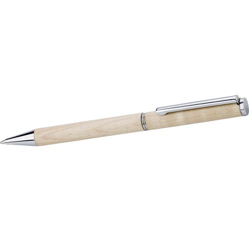 Maple wood ballpen with twist action mechanism, metal clip and blue ink.