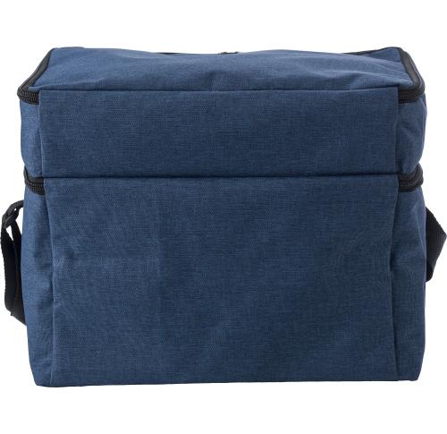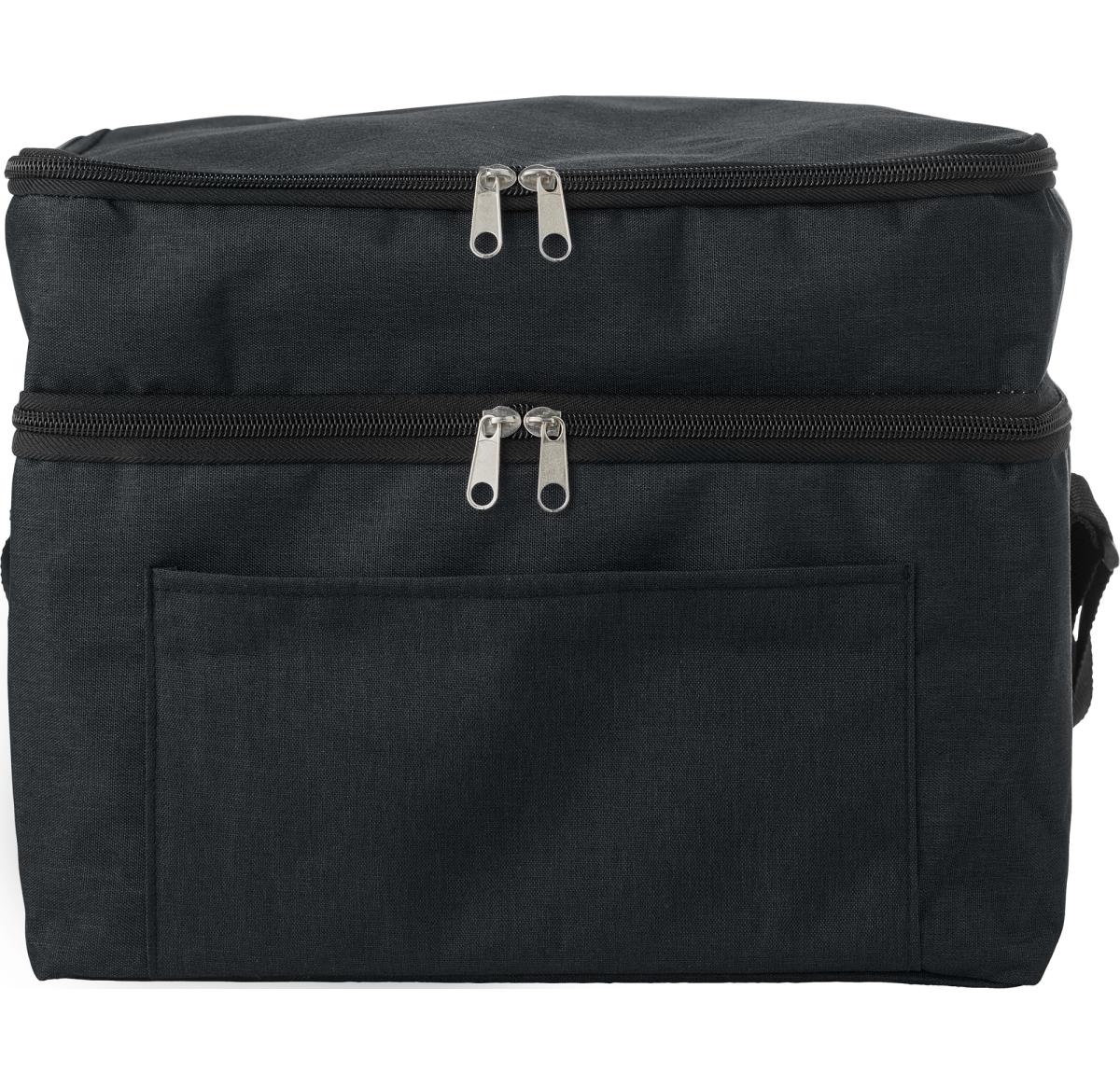 Cooler bag with aluminium foil interior and two zipped compartments. Includes a carrying strap.