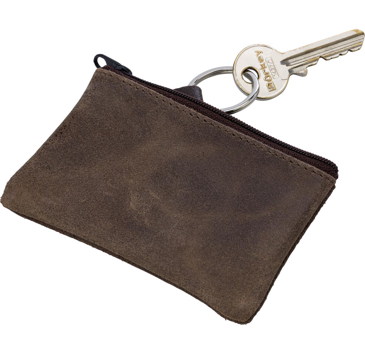 Key wallet with metal ring and zip.