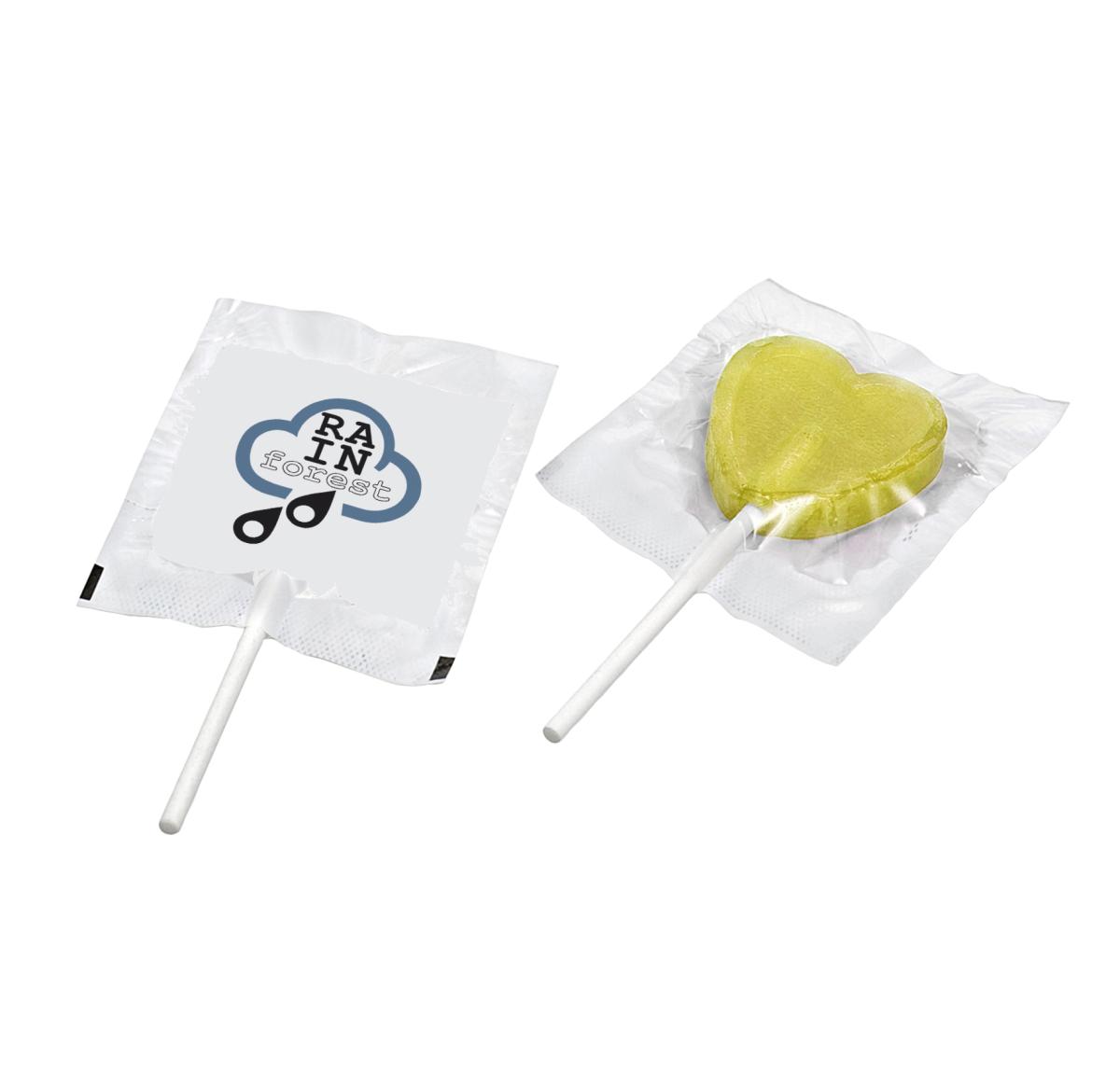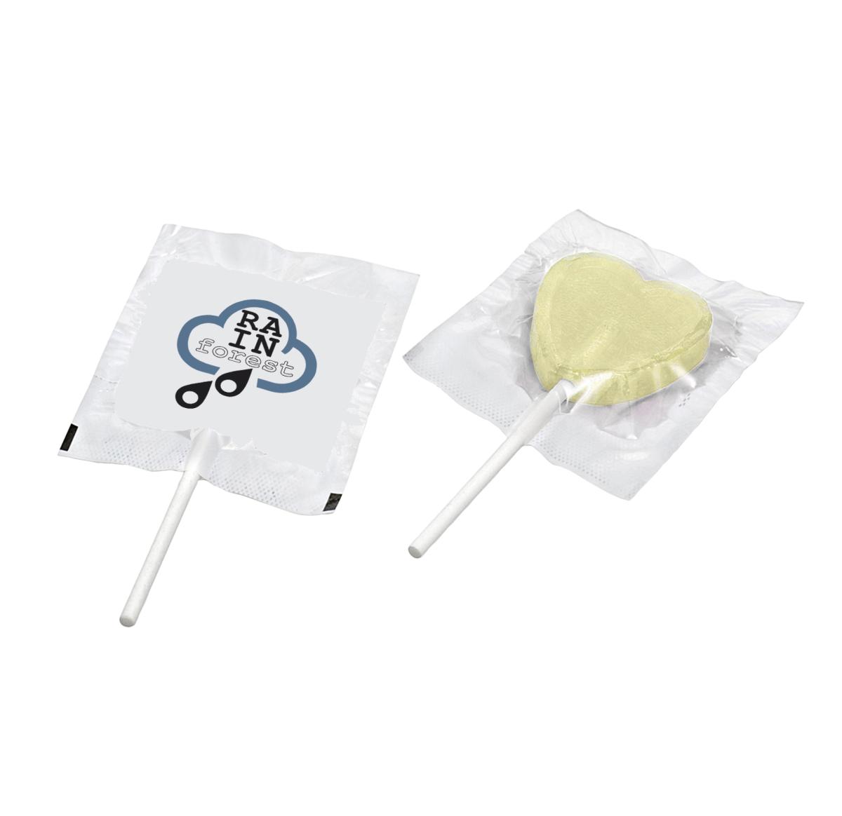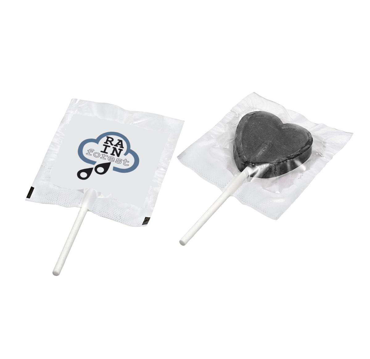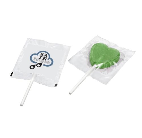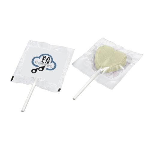 Flat round lollipops available in cherry flavour. Available in a heart shape.