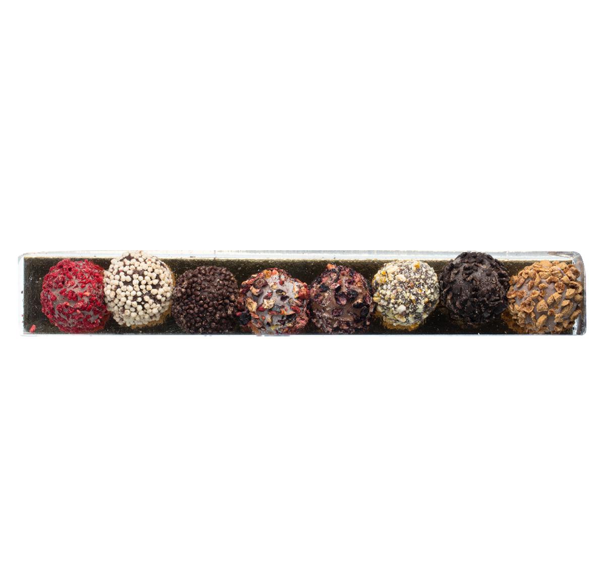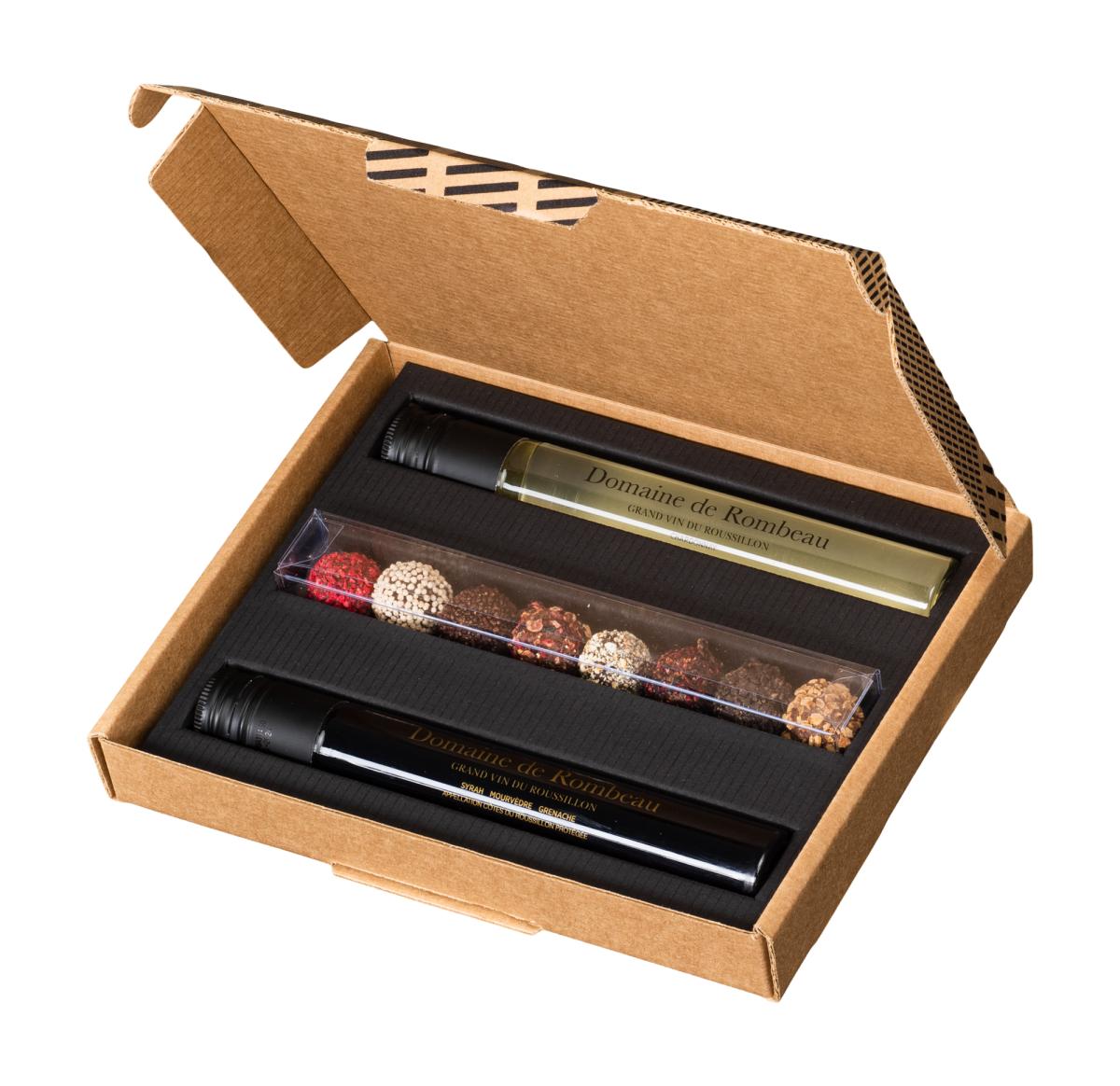 Unveil a world of sophistication with our Wine Tasting Set. Encased in a rustic kraft letterbox, discover two 100 ml rPET tubes filled with the finest wines from Domaine de Rombeau. Paired harmoniously with chocolate truffles, this set promises a journey of exquisite flavours. Perfect for gifting or personal enjoyment. Elevate your taste today.