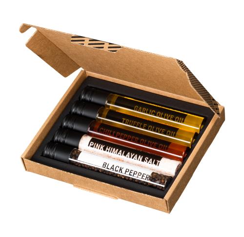 Experience culinary excellence with our Cooking Box featuring 5 rPET Tubes. This letterbox gift includes Himalayan salt, bold black pepper, and three exquisite olive oils: truffle, chili pepper, and garlic. Elevate your dishes effortlessly. Perfect for food enthusiasts and eco-conscious individuals. Order now for a flavourful adventure.
