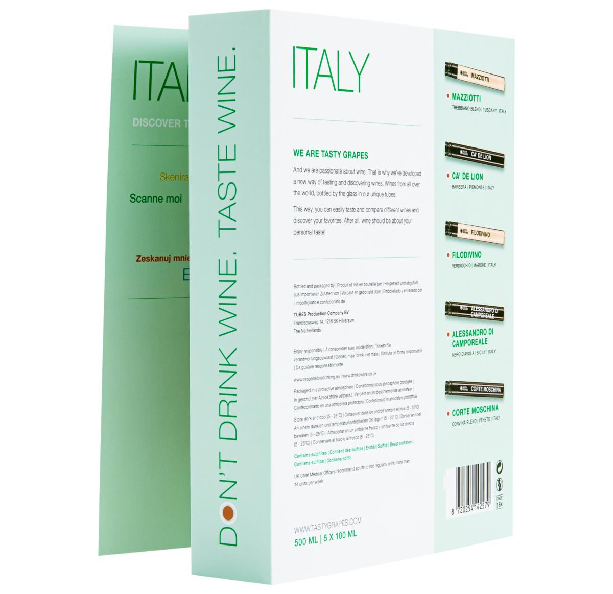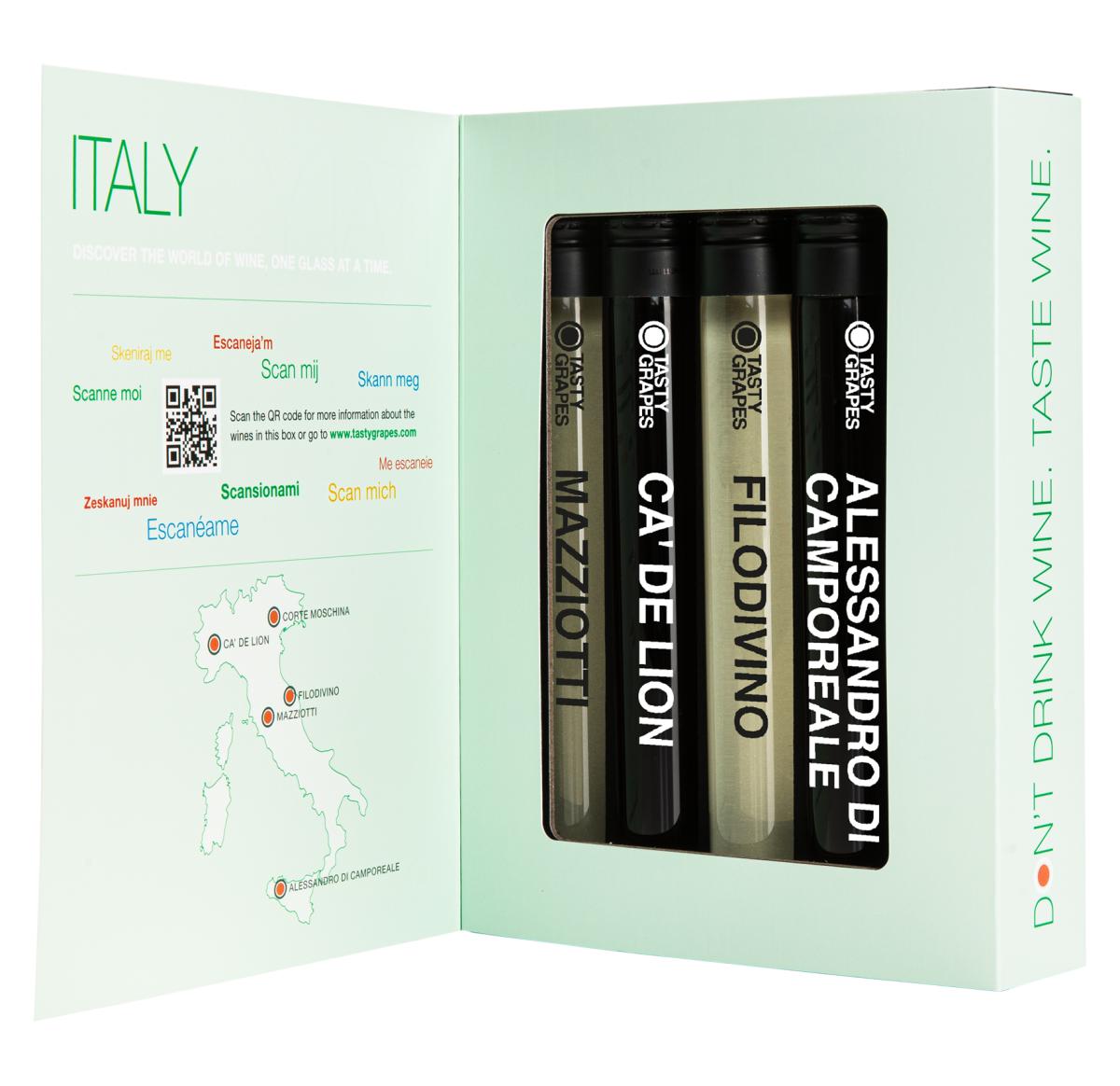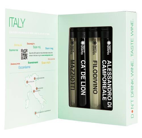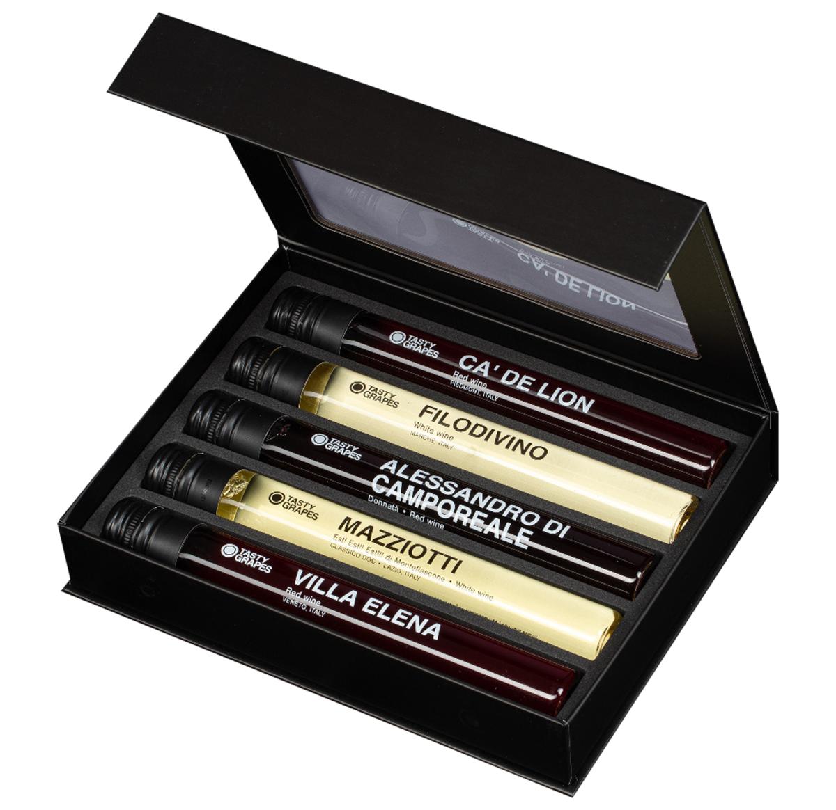 Experience the essence of Europe's finest vineyards with Tasty Grapes' Wine Tasting Luxury Gift Box. Unbox a curated selection of five 100 ML glass tubes, each filled with exquisite wines from Italy. Elevate your palate and indulge in the art of winemaking from three renowned countries, all elegantly packaged for your enjoyment.