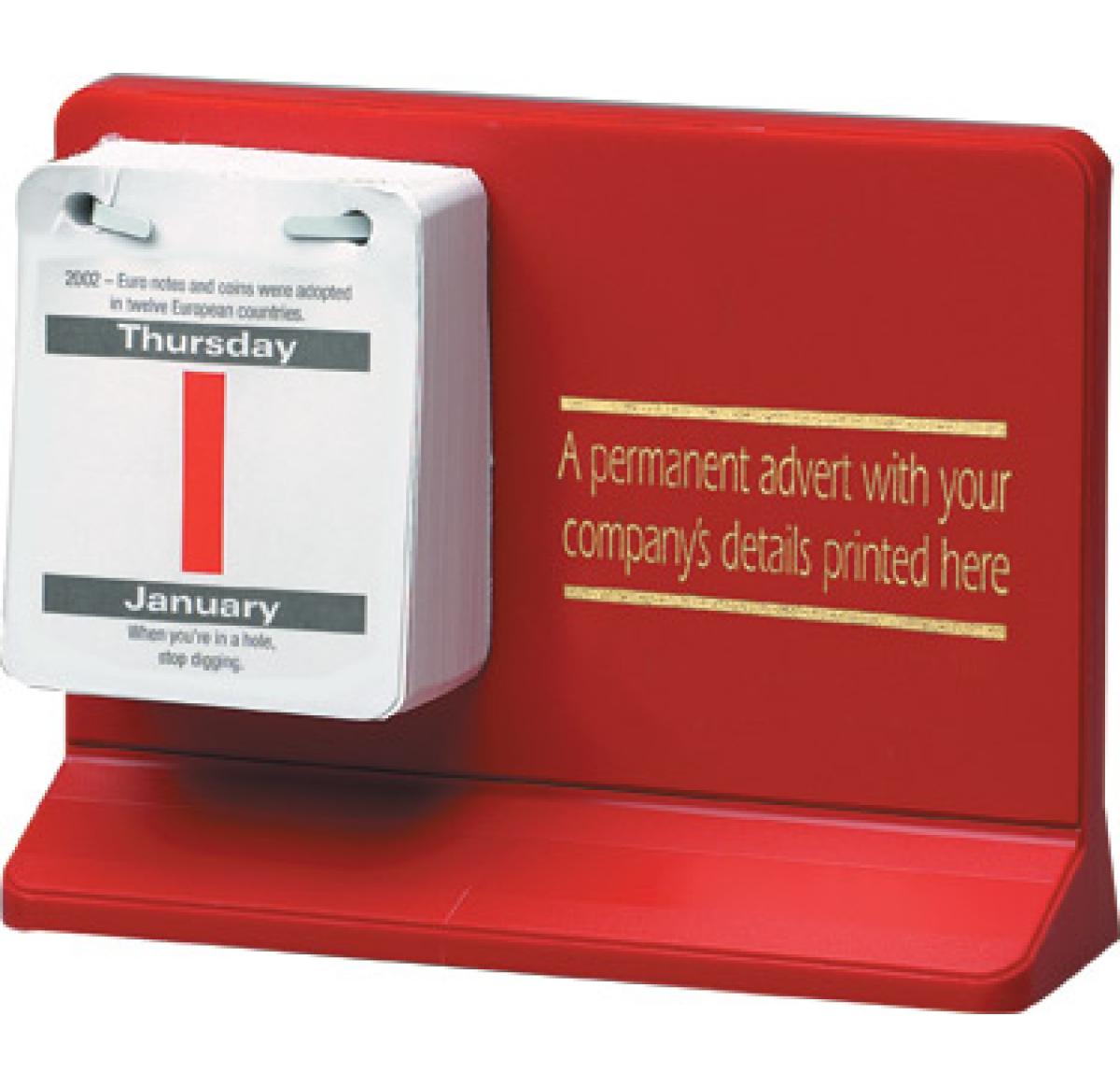 Plastic moulded base, with Daily Pad, Silk screened or foil blocked. Colours: Black, Blue, Red, White. Packed in cartons.