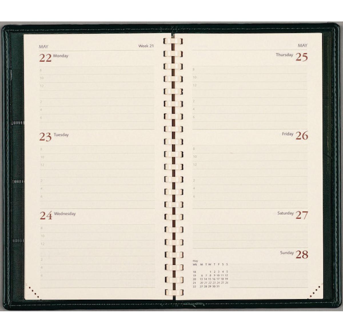 Spiral Week To View Portrait pocket diaries. Inserted into Classic Deluxe covers with material credit card pockets inside the front cover. Cream paper. Gold blocked front cover - 1 wording 1 position. Perforated page corners. 24 page UK & World Maps. Ace
