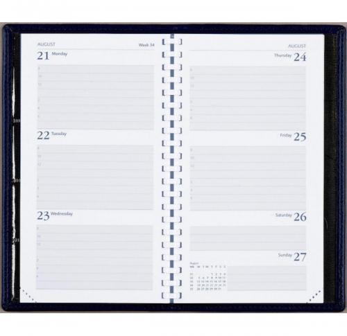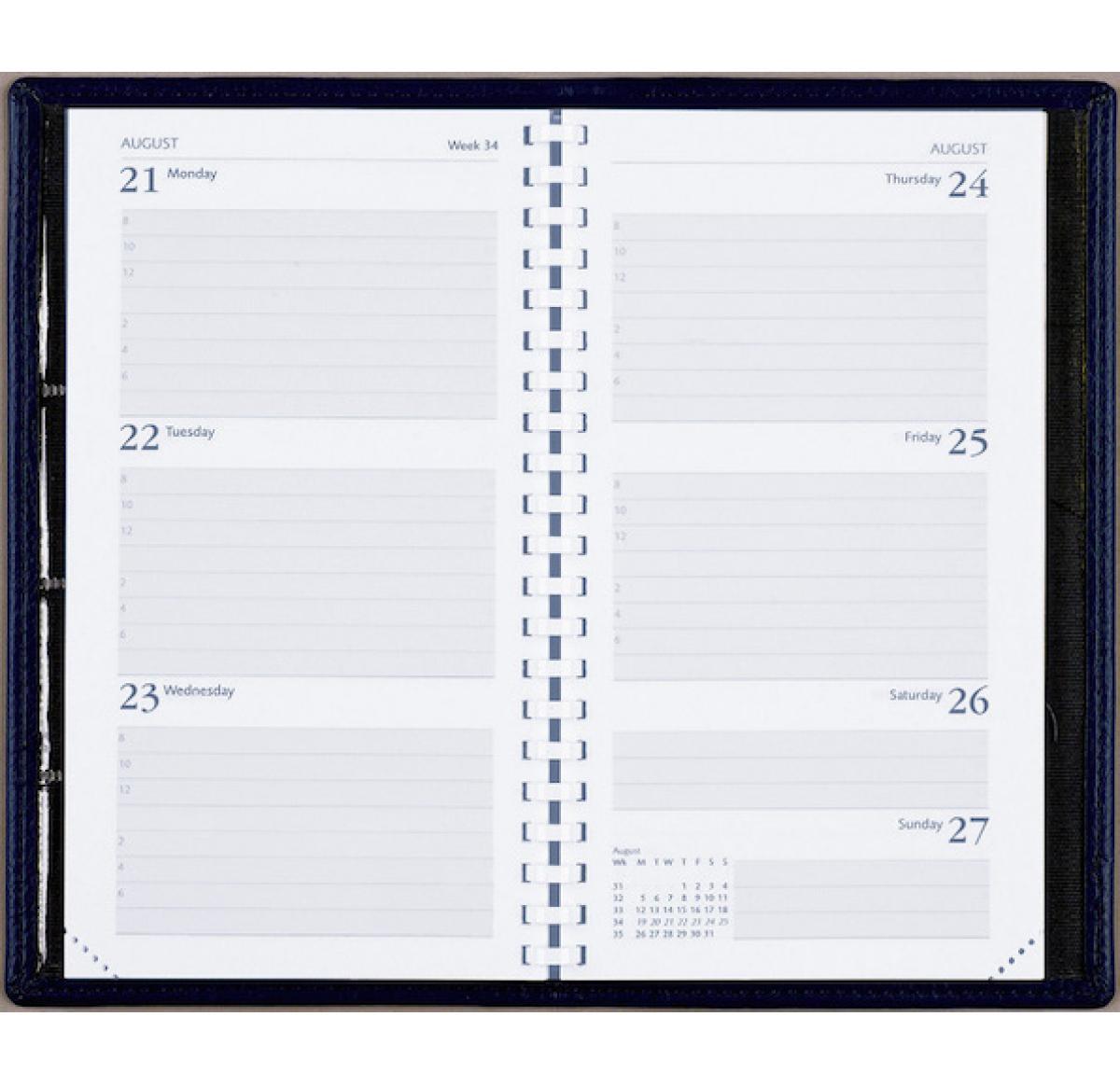 Spiral Week To View Portrait pocket diaries. Inserted into Classic Deluxe covers with material credit card pockets inside the front cover. White paper. Gold blocked front cover - 1 wording 1 position. Perforated page corners. 24 page UK & World Maps. Ace