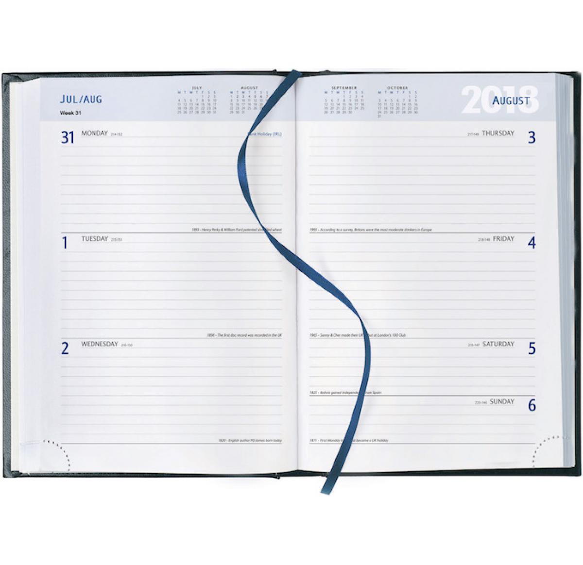 A5 Week to View desk diaries with a 4-colour process cover - padded front & rear. Gloss or Matt laminate. White paper. Ribbon marker. Perforated page corners. Packed in bulk.