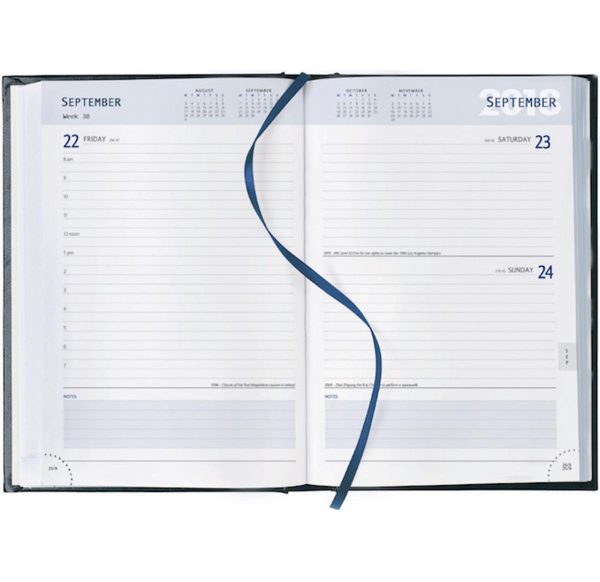 A5 Pagaday desk diaries with a 4-colour process cover - padded front & rear. Gloss or Matt laminate. White paper. Ribbon marker. Perforated page corners. 24 page UK & World Maps. Packed in bulk.