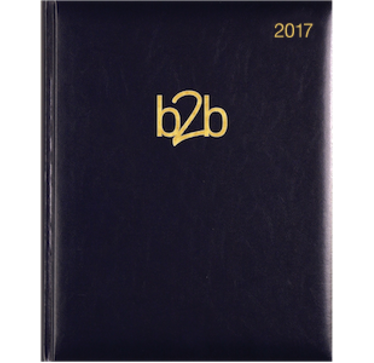 Management desk diaries. Bound in Strata. White paper. Gold or silver blocked front cover - 1 wording 1 position. Year date gold or silver blocked top right. Padded front and rear covers. Ribbon marker. Perforated page corners. Packed in bulk.