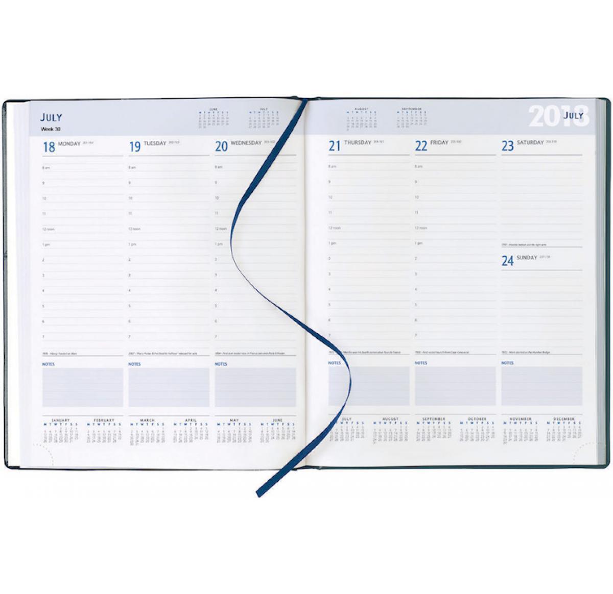 Management Deluxe desk diaries. Bound in Strata. White paper. Silver blocked front cover - 1 wording 1 position. Year date silver blocked top right. Padded front and rear covers. Silver edges. Ribbon marker. World Maps. Perforated page corners. Packed in
