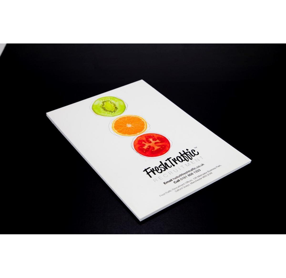 A7 Desk Pad, 50 sheets of 80gsm paper, printed 1 colour, glued at head or foot to backboard, bulk packed in cartons.