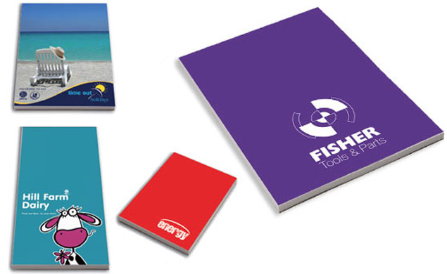 1/3 A4 Desk Pad, 50 sheets of 80gsm paper, printed 1 colour, wrap around cover printed 4 colours, glued at head or foot to backboard, bulk packed in cartons.