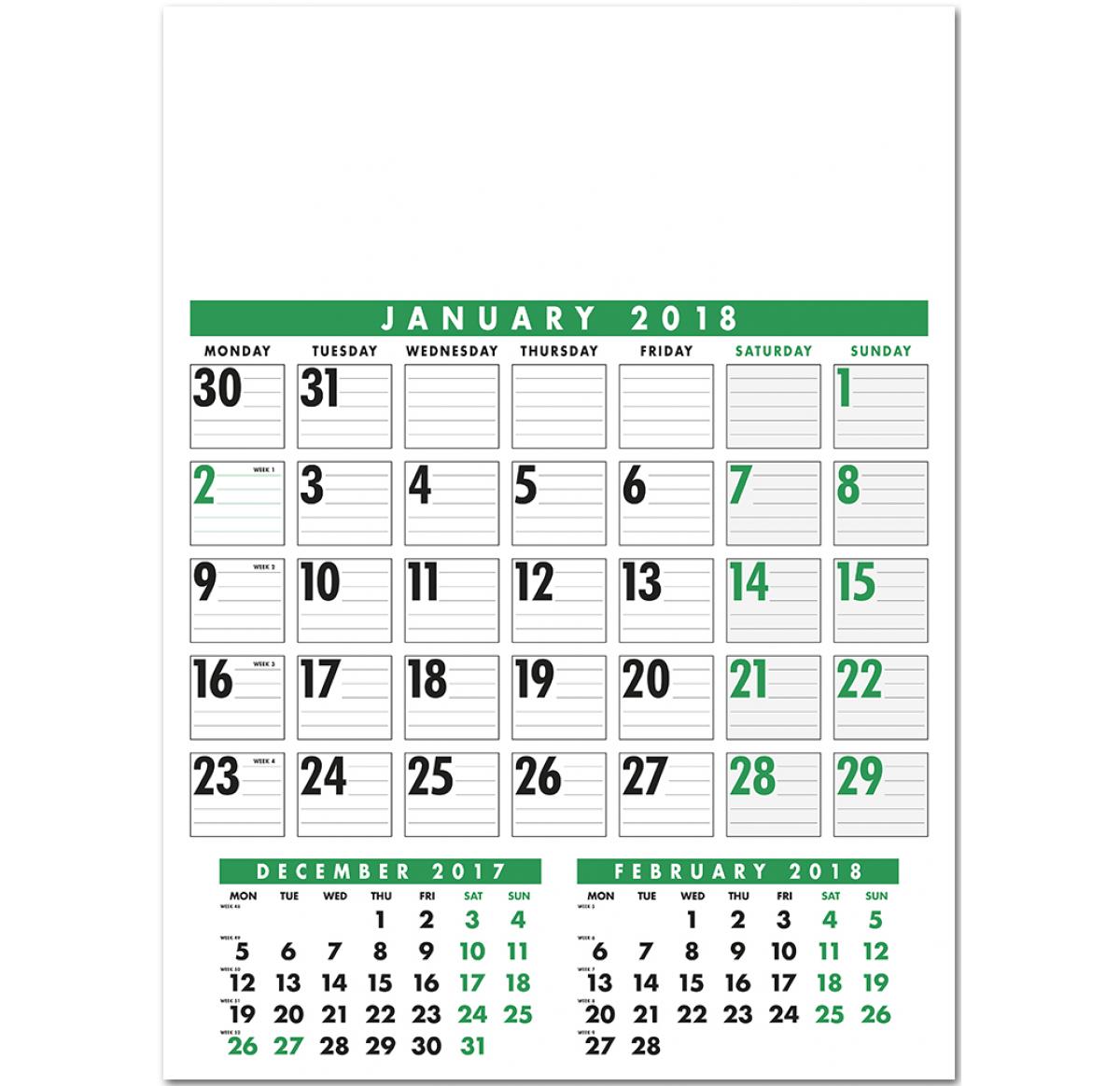12 leaf wall calendar, with dates and space for important notes - printed in green and black