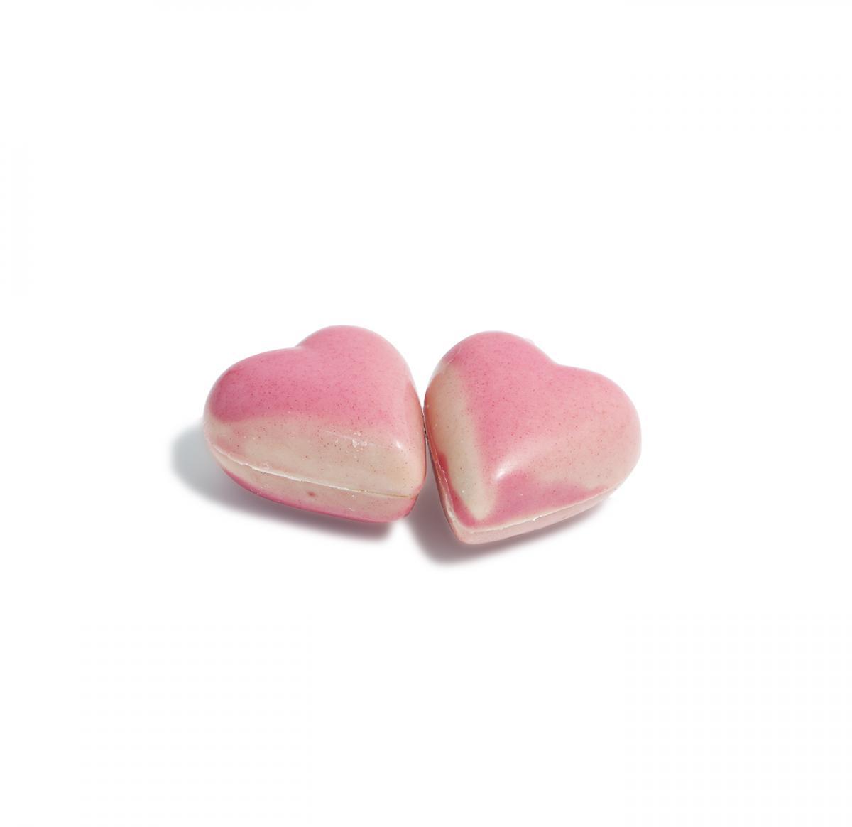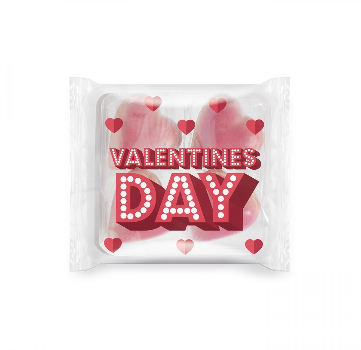 Flow wrapped Pink Truffle Hearts in a tray. Branded with a full colour digital print to the film.