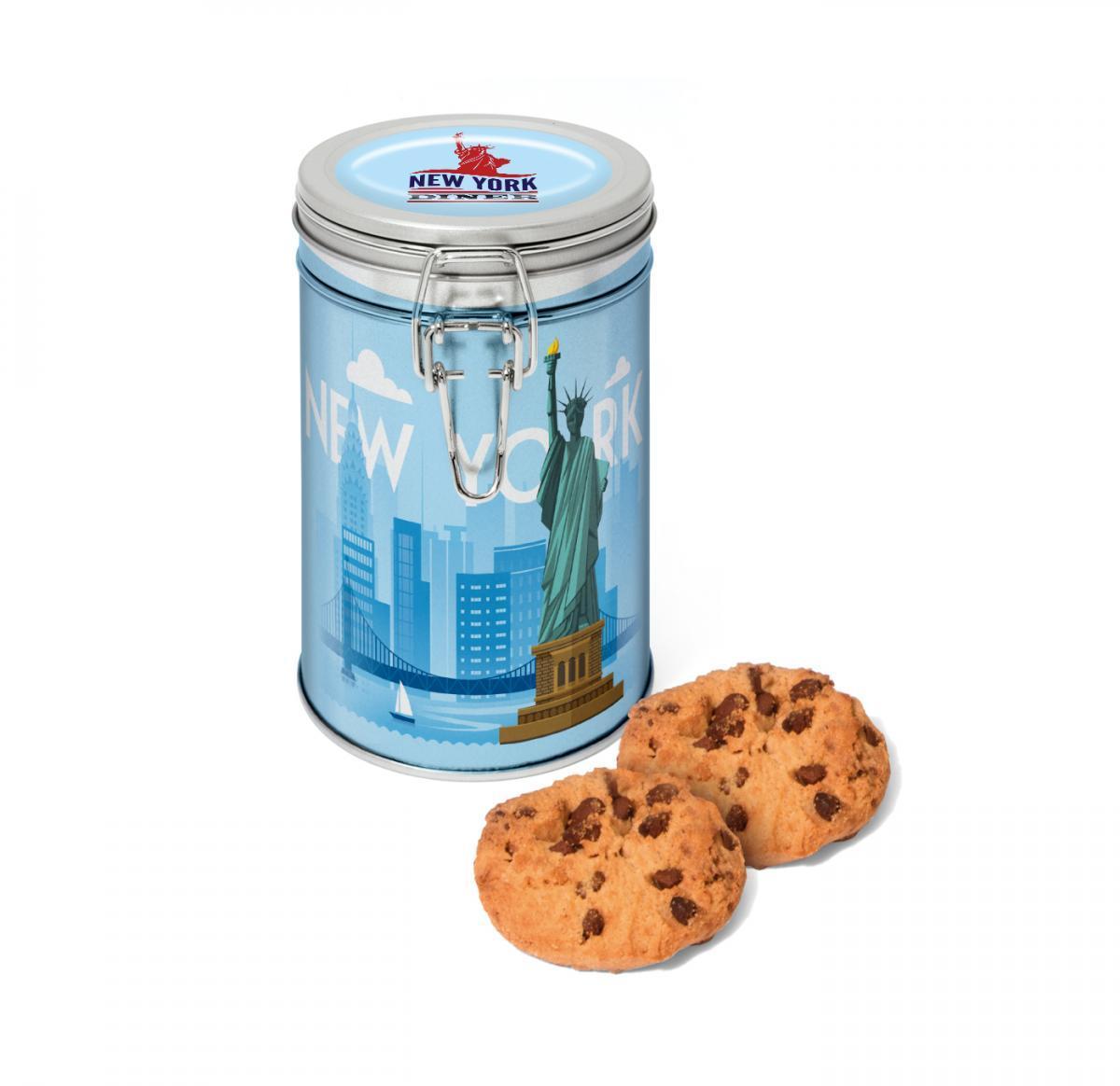 Silver Flip Top Tin filled with Maryland chocolate chip cookies. Branded with a full colour dome label to the lid and gloss belly wrap.
