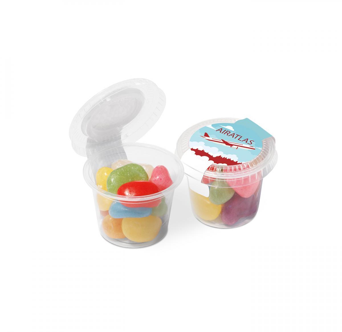 Mini plastic free eco pot, filled with Jolly Beans. Branded with a full colour paper wrap. These pots are made from plant based materials rather than plastic. Once enjoyed they can be disposed of in commercial food waste recycling to compost.