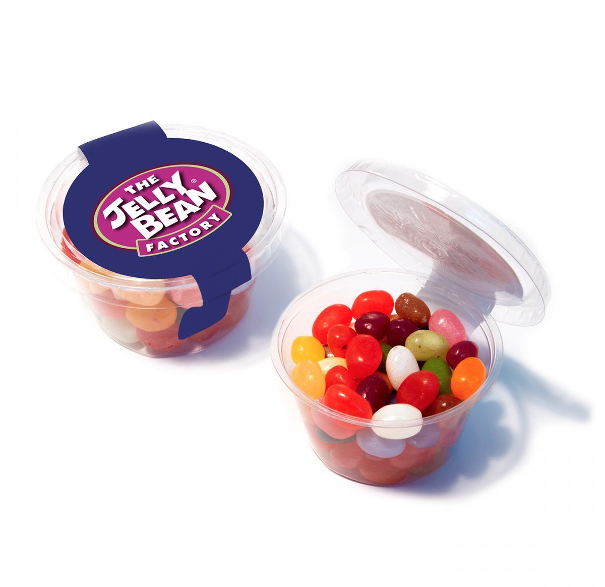 Maxi plastic free eco pot, filled with Jelly Bean Factory jelly beans. Branded with a full colour paper wrap. These pots are made from plant based materials rather than plastic. Once enjoyed they can be disposed of in commercial food waste recycling to compost.