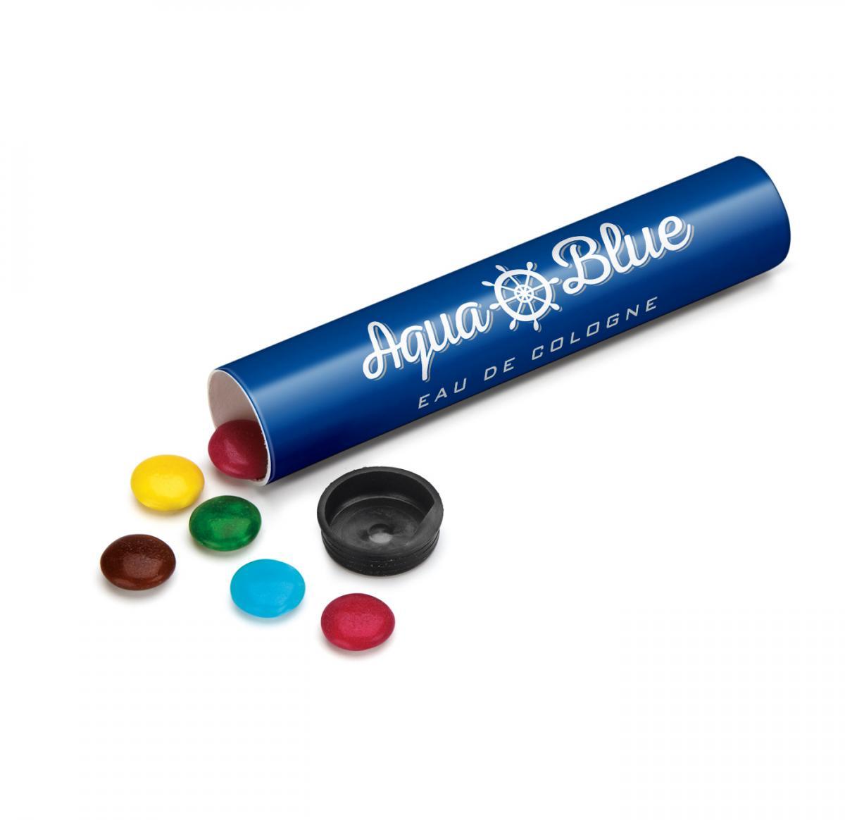 A Sweet Tube filled with sugar coated chocolate Beanies. Branded with a full colour semi-gloss wrap to the tube.