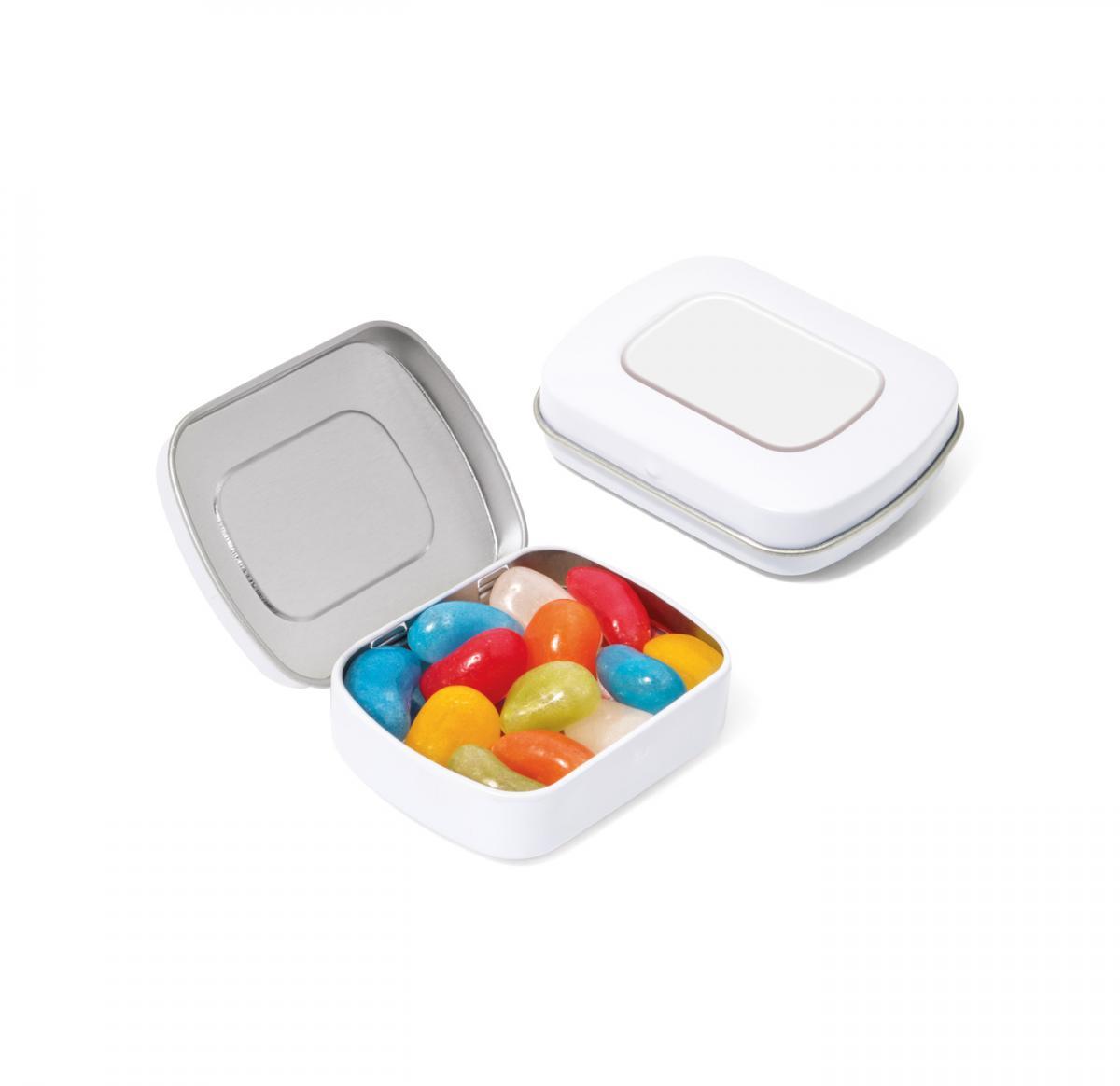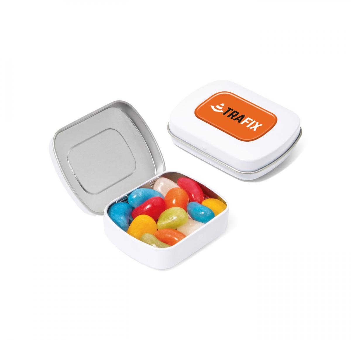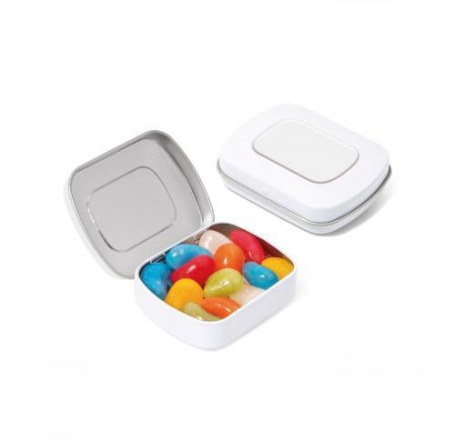 A small Pocket Tin filled with Jolly Beans. Branded with a full colour domed label to the lid.