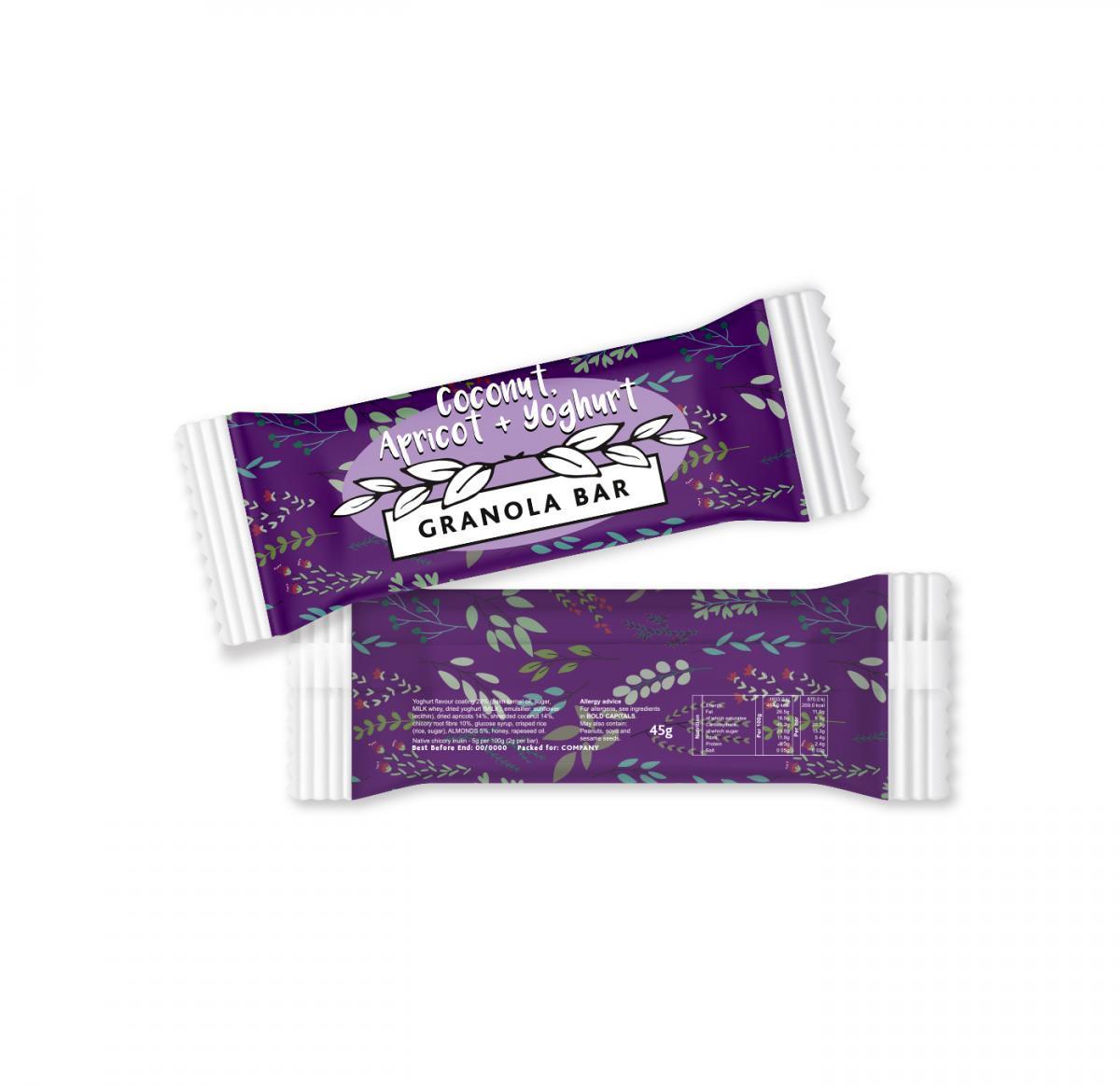 A flow wrapped Coconut, Apricot and Yoghurt granola bar. Branded with a full colour digital print to the film.