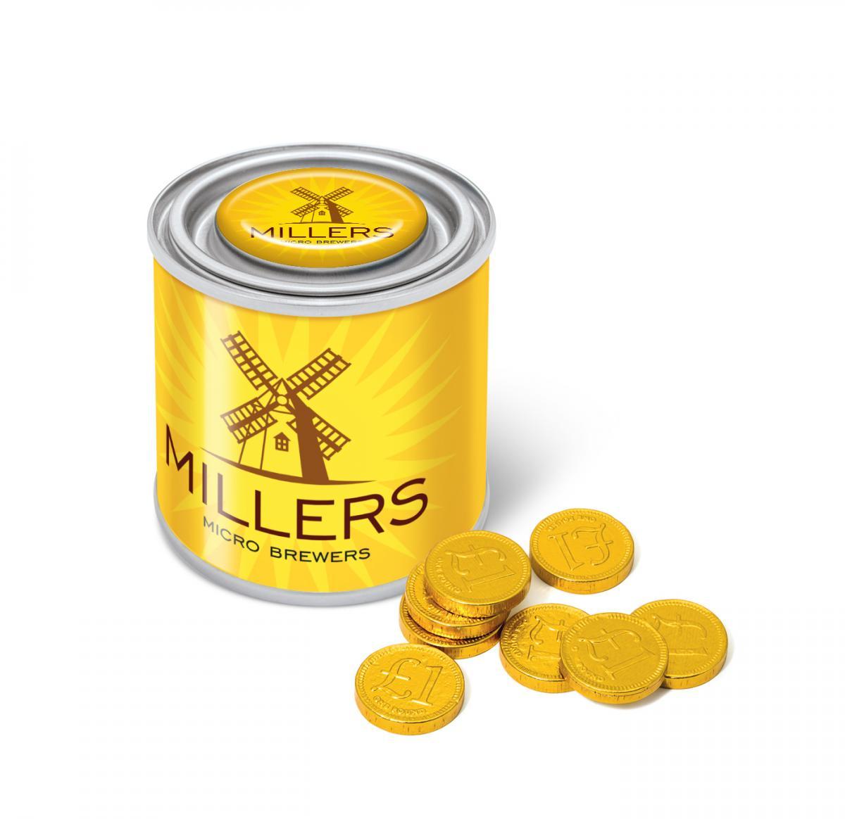 A small Paint Tin filled with foil wrapped chocolate coins. Branded with a full colour domed label to the lid, and cast-gloss wrap to the tin.