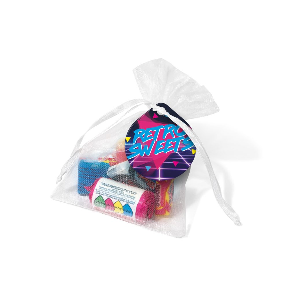 A white Organza Bag filled with a Retro Sweet mix. Branded with a full colour card tag.