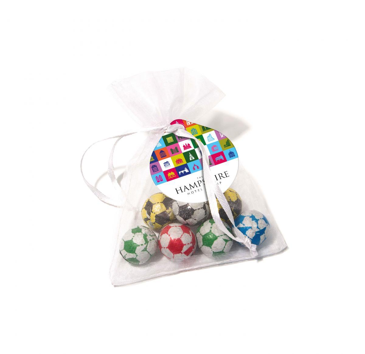A white Organza Bag filled with foil wrapped chocolate footballs. Branded with a full colour card tag.