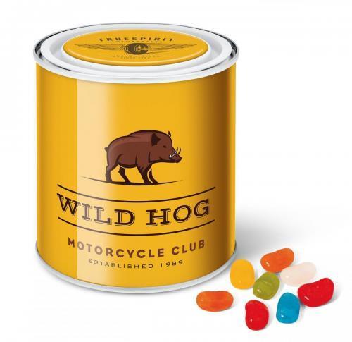 A large Paint Tin filled with Jolly Beans. Branded with a full colour domed label and cast-gloss wrap.