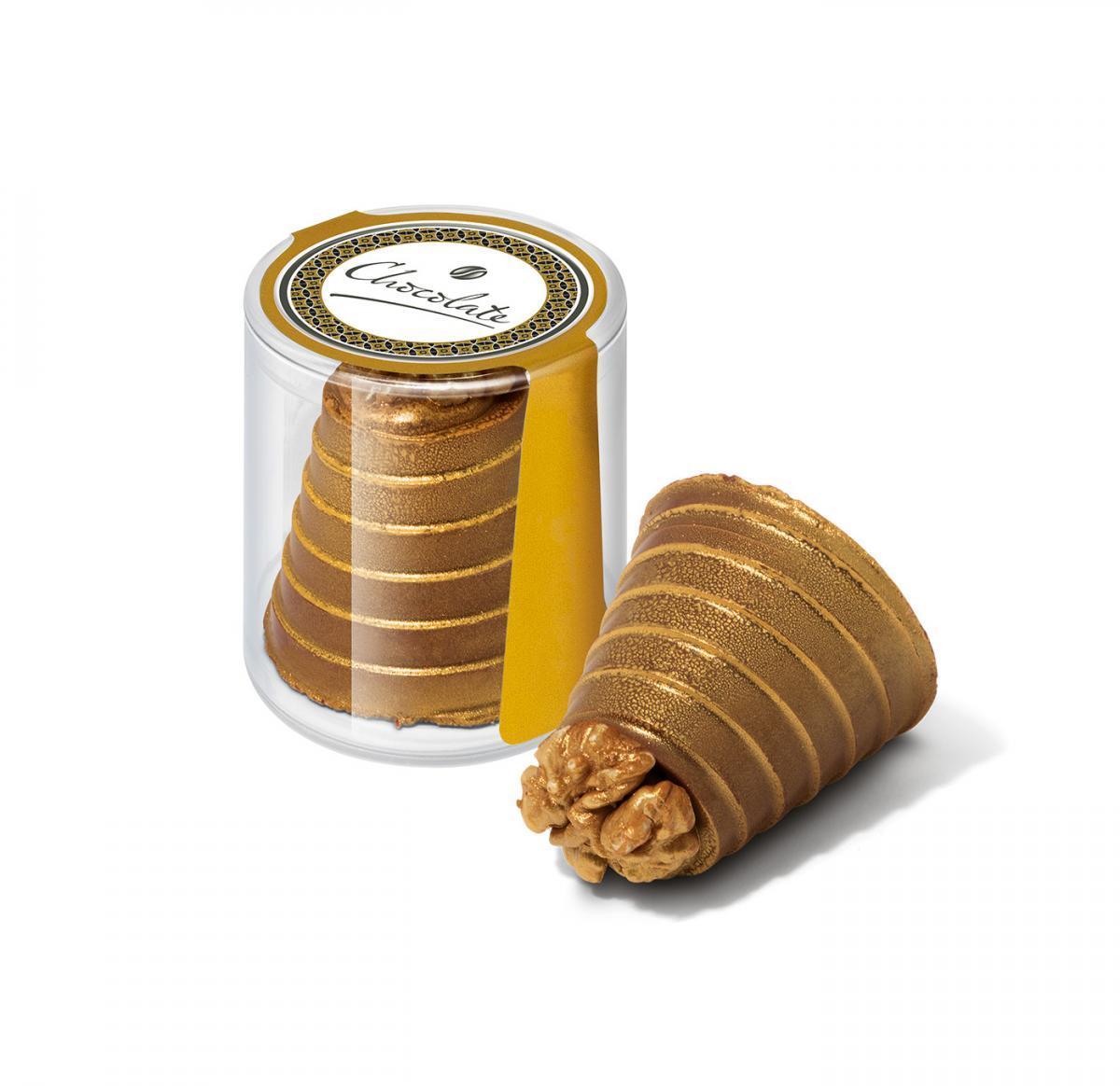 A clear pot filled with a gold sprayed chocolate walnut whirl. Branded with a shiny silver media wrap and finished with a full colour domed label to the lid.