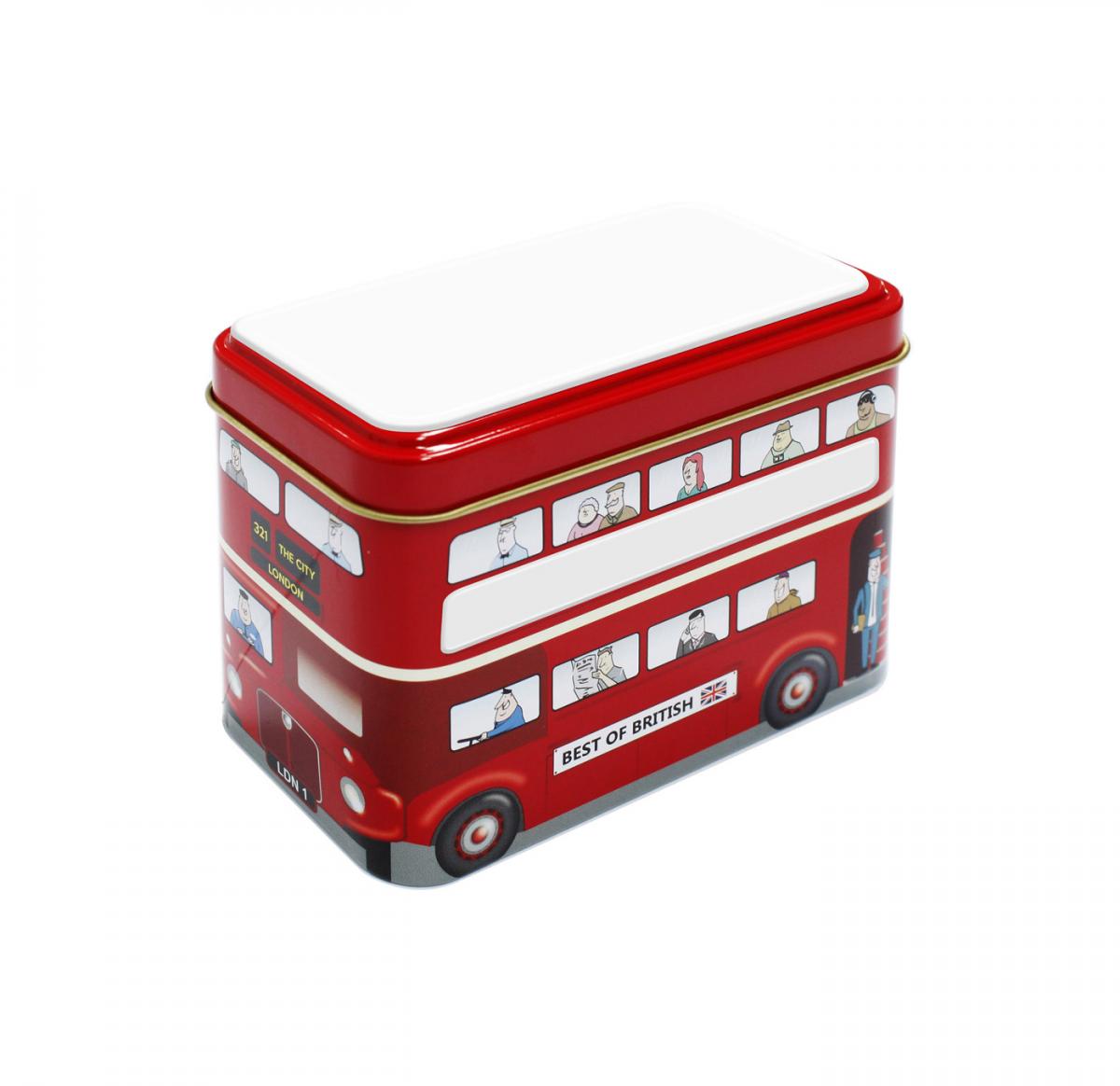 A Bus Tin filled with Kalfany Fruit Gums. Branded with full colour domes to the lid and both sides of the tin.