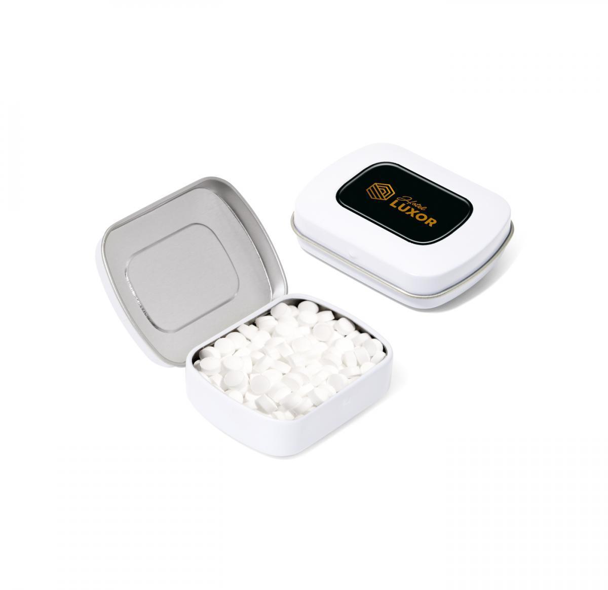 A small Pocket Tin filled with sugar free mini mints. Branded with a full colour domed label to the lid.