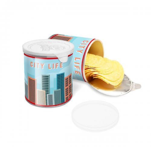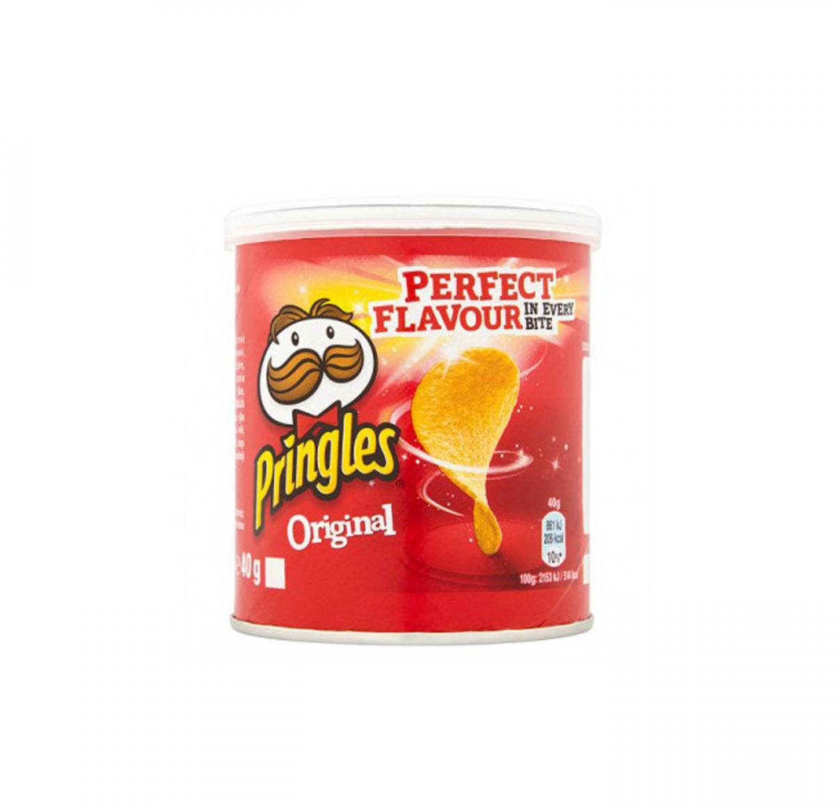 An Original 40g Pringles Pot branded with a full colour wrap to the the pot.A red key-line is added to the top and bottom of the branded wrap to ensure a smart finish as the pots can sometimes vary in size.