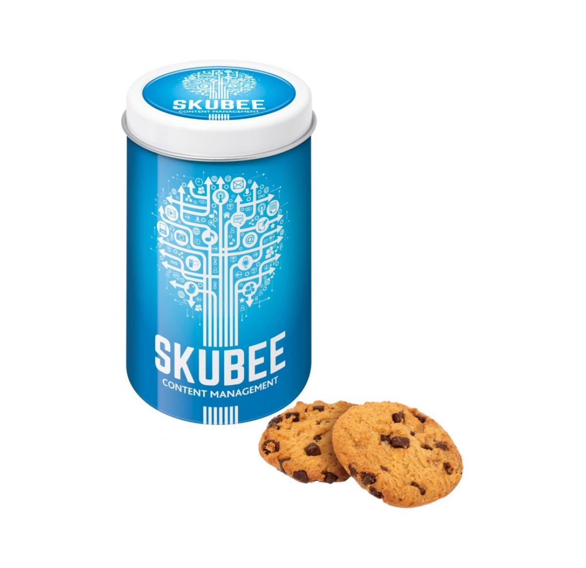 Our Snack Tin is fully branded with a wrap around the tin and dome label on the lid. Filled with individually wrapped Maryland Cookies.