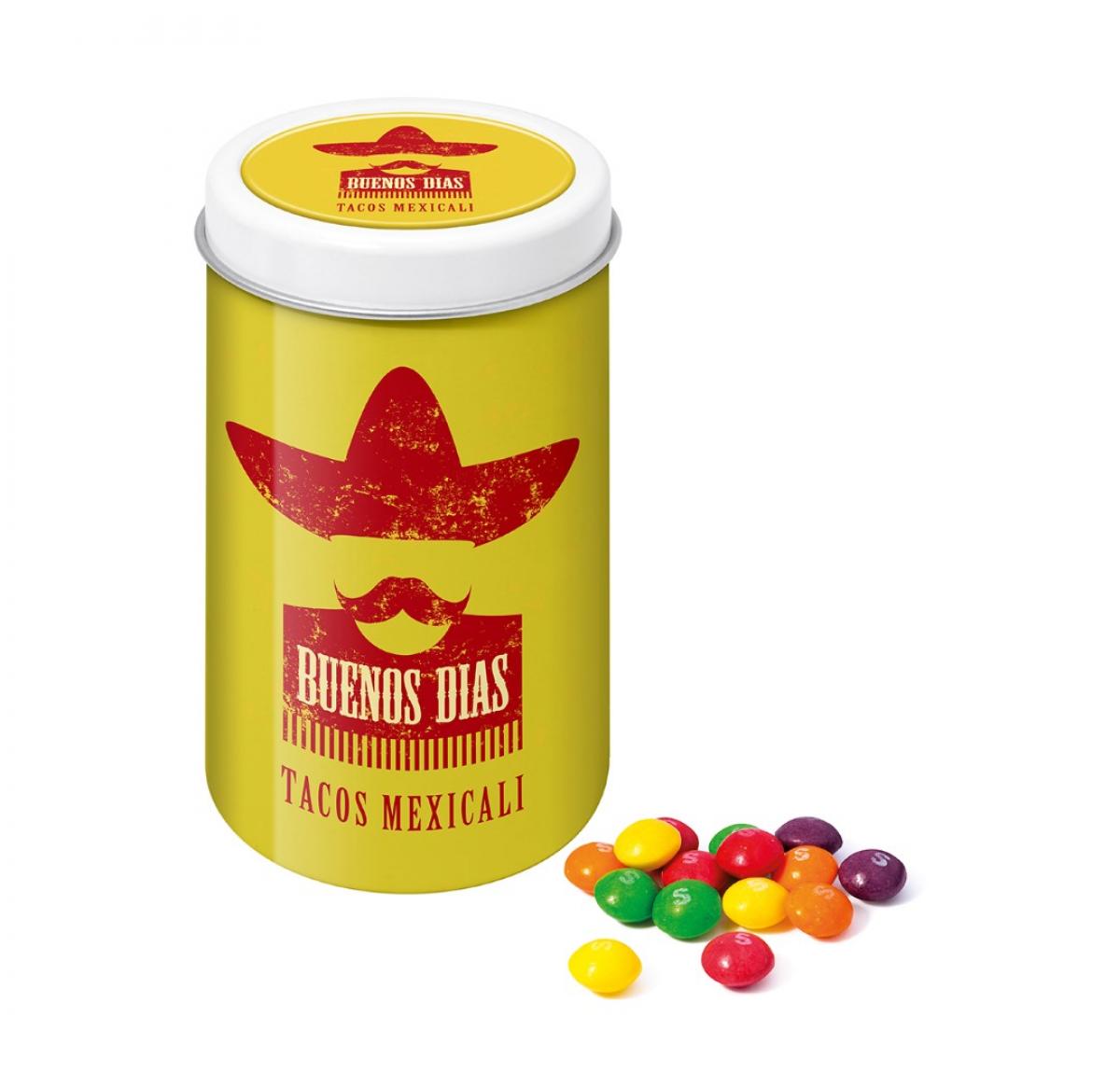 Our Snack Tin is fully branded with a wrap around the tin and dome label on the lid. Filled with Skittles.
