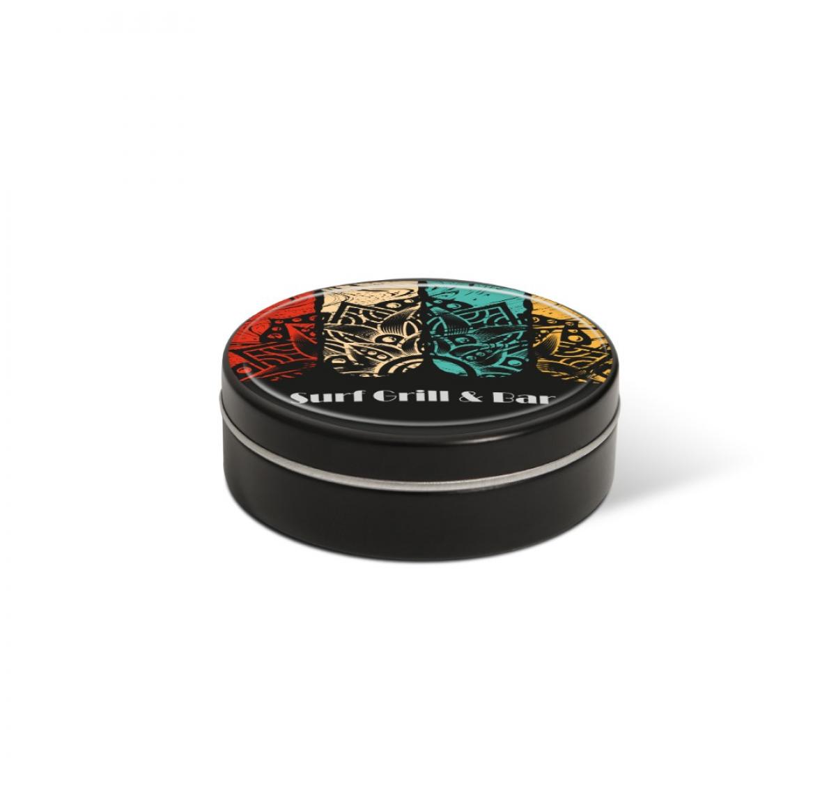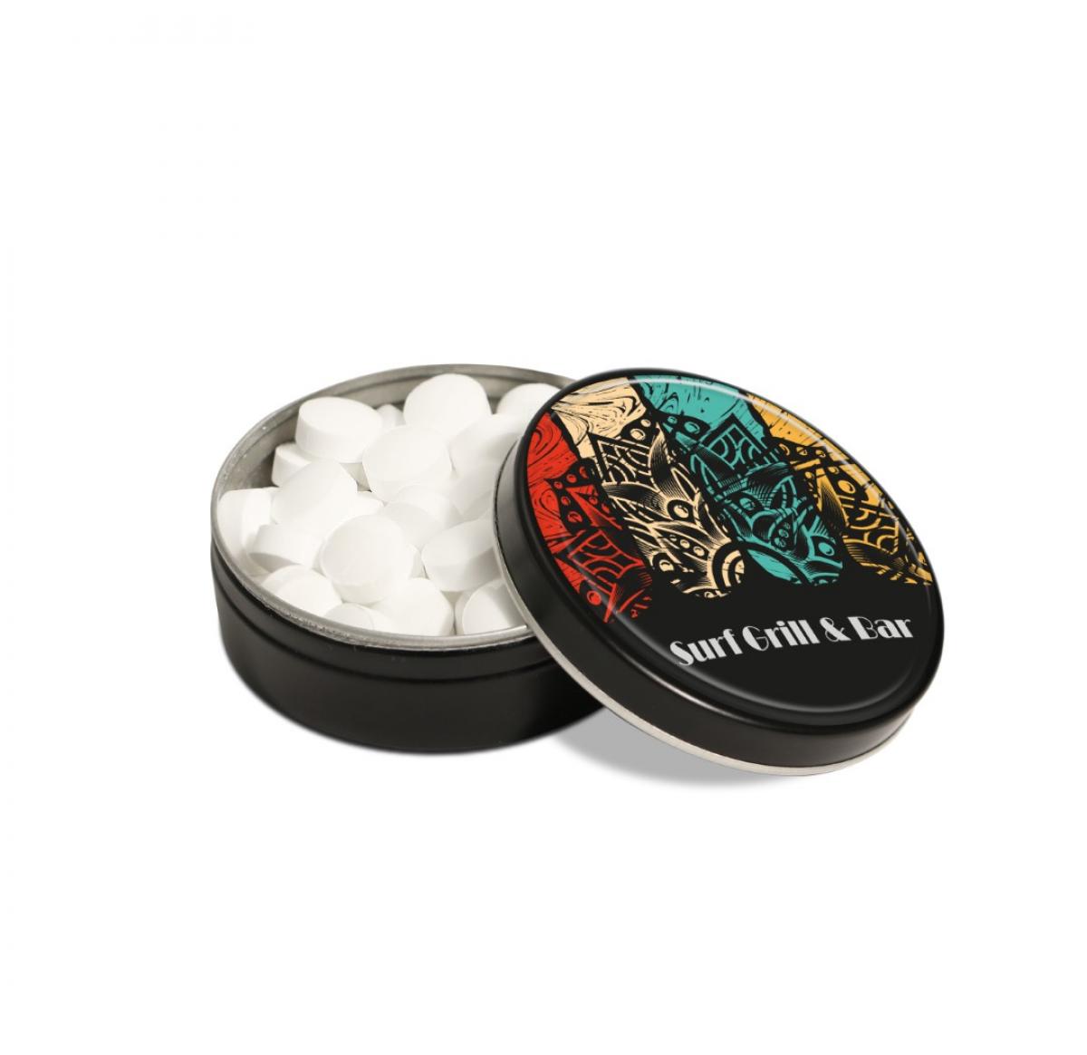 A small black tin filled with sugar free peppermints. These mints are tooth friendly, sweetened with Stevia. Branded with a full colour domed label to the lid.