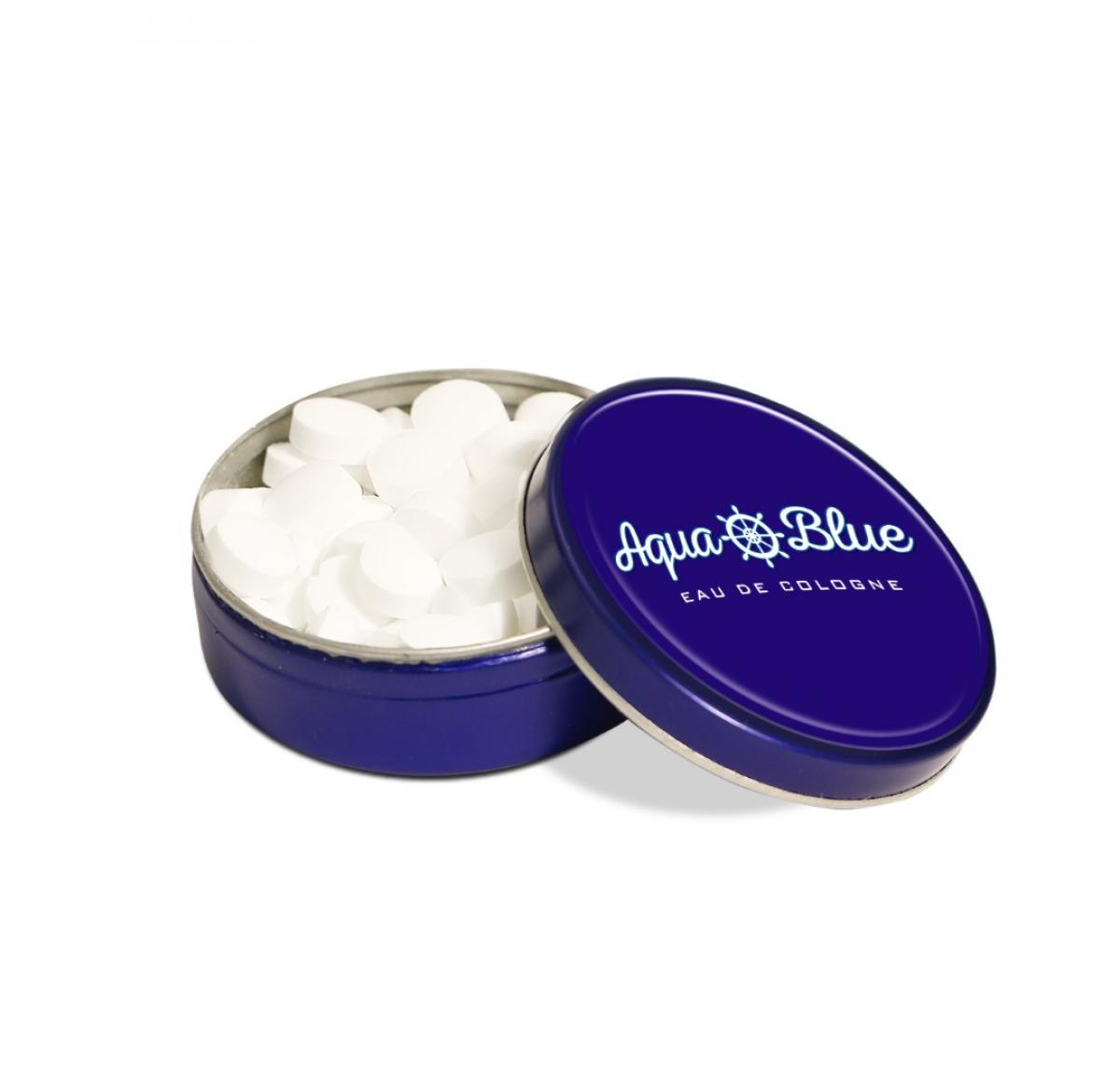 A small blue tin filled with sugar free peppermints. These mints are tooth friendly, sweetened with Stevia. Branded with a full colour domed label to the lid.