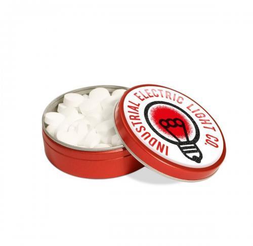 A small red tin filled with sugar free peppermints. These mints are tooth friendly, sweetened with Stevia. Branded with a full colour domed label to the lid.
