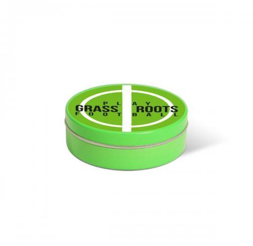 A small green tin filled with sugar free peppermints. These mints are tooth friendly, sweetened with Stevia. Branded with a full colour paper label to the lid.