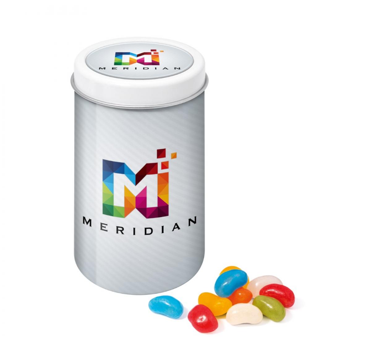 Our Snack Tin is fully branded with a wrap around the tin and dome label on the lid. Filled with Jolly Beans.*Can be reused as a desk tidy*