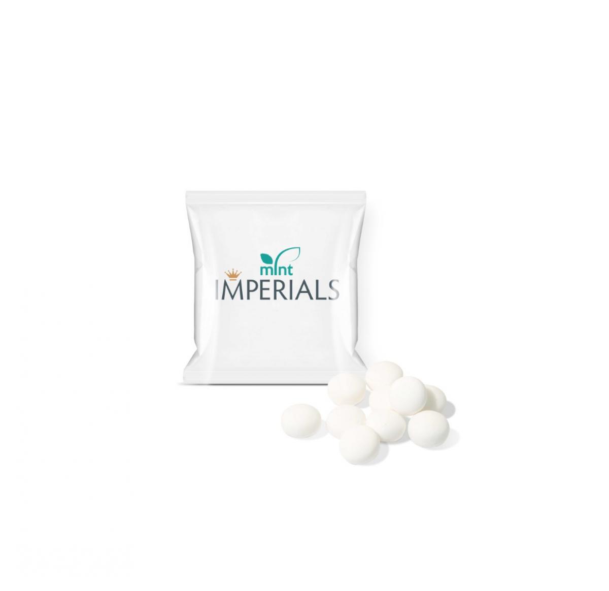Fully branded flow bag with mint imperials.*White Film Only for QTY up to 2000.**Clear & White Film Available for QTY of 2000+.*