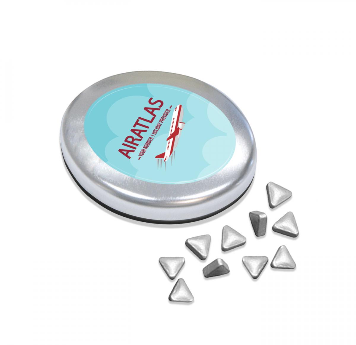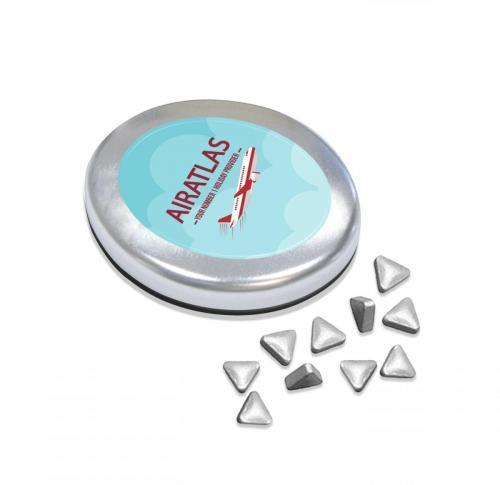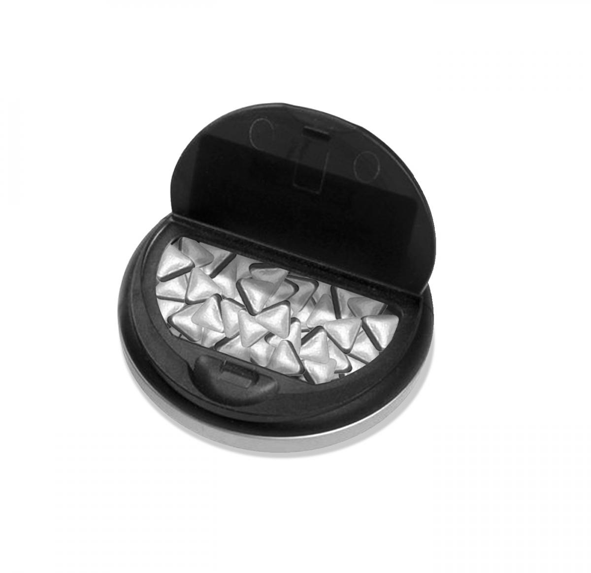 Silver metal tin with plastic dispenser and snap lock, Filled with silver peppermint triangles.