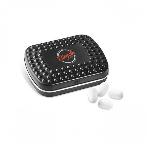 A White, silver or black matt metal tin, with a rectangular hinged and embossed lid. Filled with TicTac Fresh Mints.Choose the colour of your tin when placing your order!