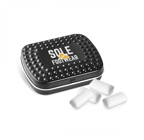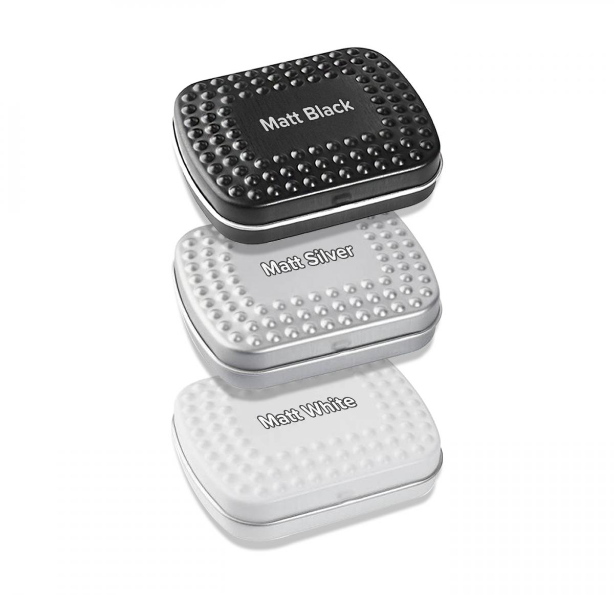 A White, silver or black matt metal tin, with a rectangular hinged and embossed lid. Filled with Sugar Free Gum.Choose the colour of your tin when placing your order!