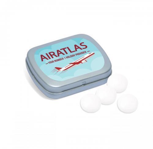 A small Pocket Tin either in Shiny White, Shiny Silver or Matt Silver finish, filled with Mentos Classic Mints. Branded with a full colour label to the lid.