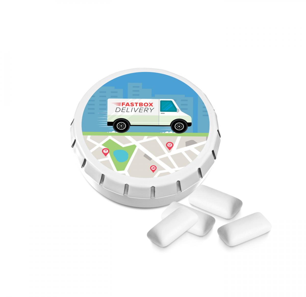 A Shiny white or silver round metal tin, filled with Sugar Free Gum. Branded on top of the lid.Choose the colour of your tin when placing your order!