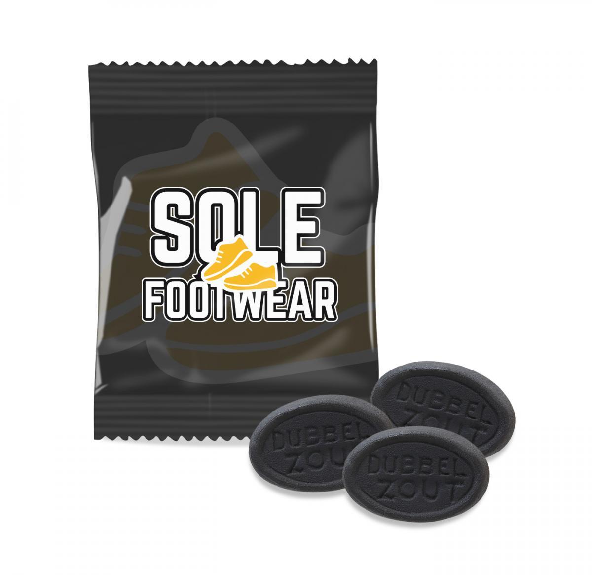 20g Flow Bag Kalfany Dubble Zout (double salty), salty-tart liquorice ovals. Branded with a full colour digital print to the film. Packed in a shiny or matt coated transparent or white bag.