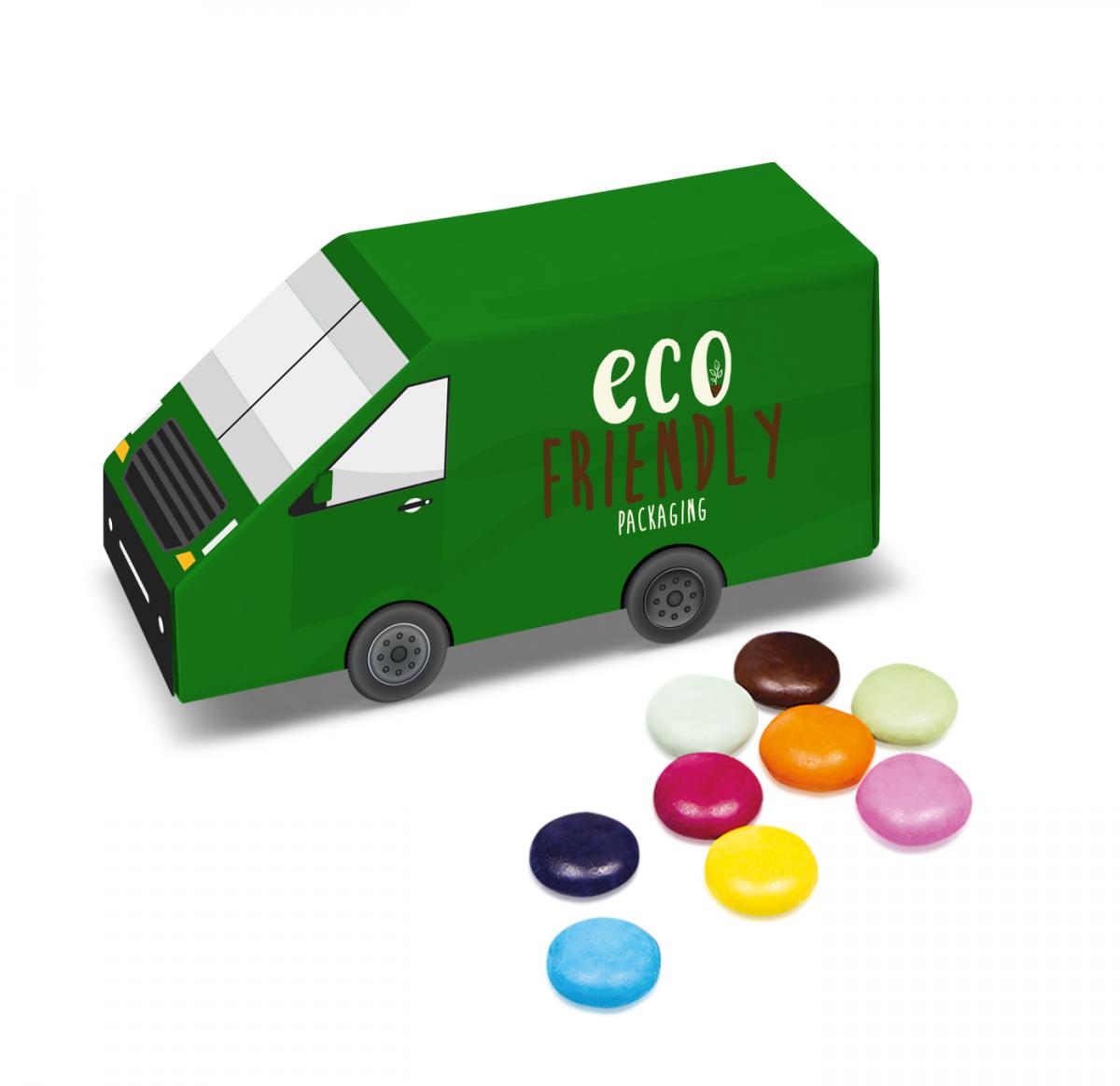 Eco Van Box comes filled with sugar coated chocolate Beanies. This filling will be in a clear eco film bag inside the box.This box is made from FSC Certified card and can be recycled or composted when finished with.MOQ starts from 250 units.