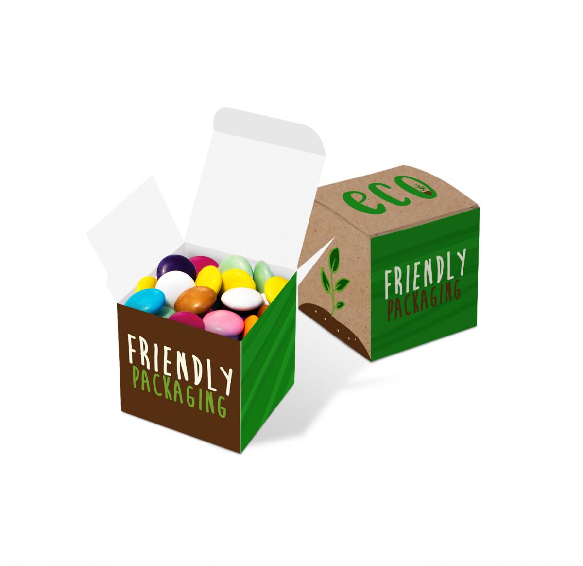 Eco Cube Box comes filled with sugar coated chocolate Beanies. This filling is scooped directly into the box.This box is made from FSC Certified card and can be recycled or composted when finished with.MOQ starts from 250 units.